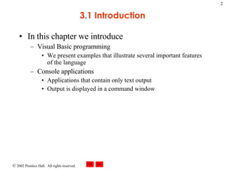 This document provides an outline and overview of Chapter 3 from an introduction to Visual Basic programming textbook. It covers simple programs that print text and perform arithmetic, memory concepts, decision making using equality and relational operators, and using dialog boxes to display messages. Example code and screenshots are included to demonstrate key concepts like variables, arithmetic operators, if/then statements, and calling methods.