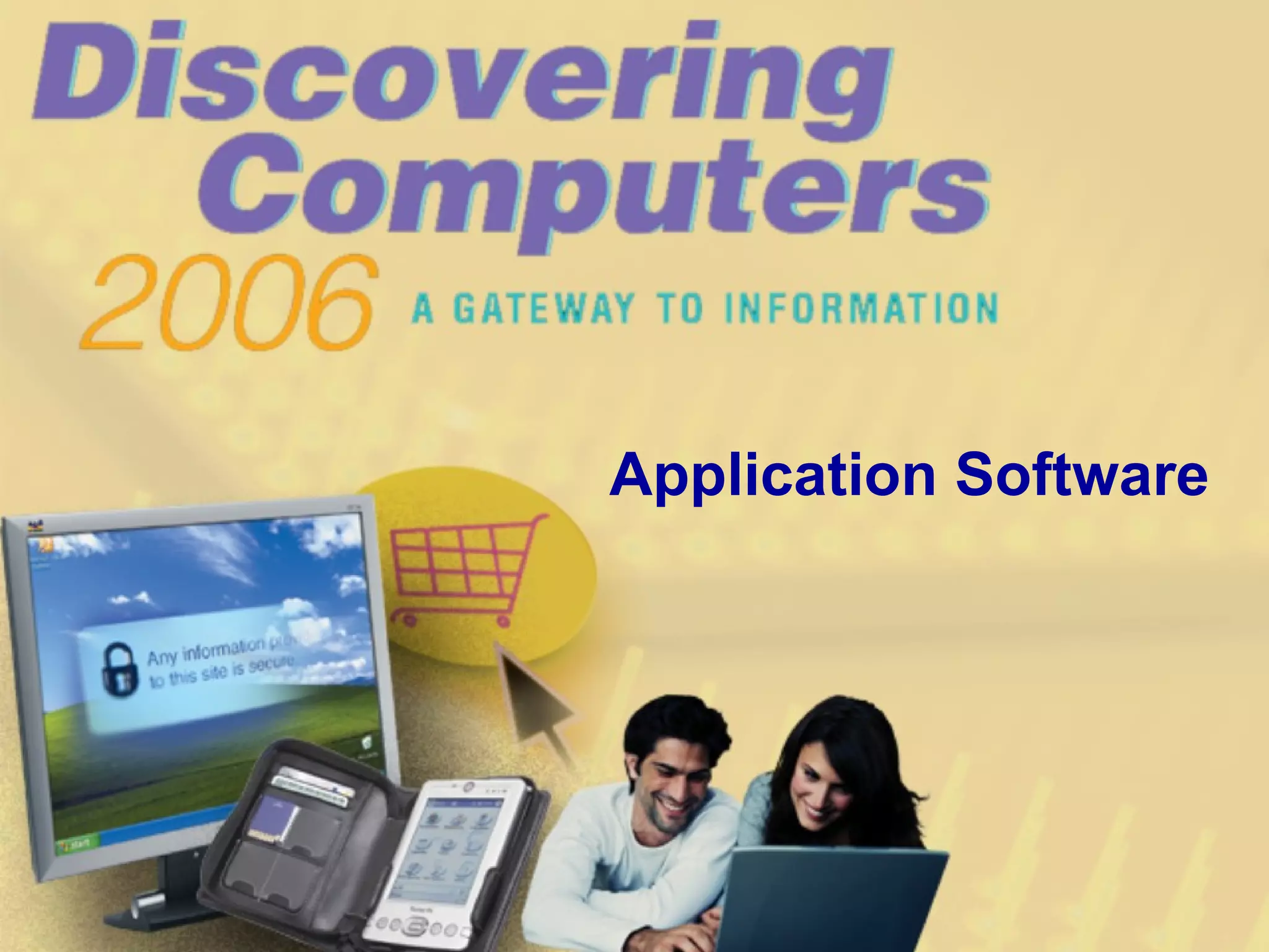 Application software includes programs for business, graphics and multimedia, home use, communications, and utilities. It is distributed as packaged software, custom software, open source software, shareware, or freeware. Users can start programs from the Start menu or desktop and interact with windows, dialog boxes, and functions. Popular business software includes word processors, spreadsheets, databases, and presentation software. Graphics software includes CAD, desktop publishing, photo editing, and multimedia authoring programs. Educational, personal, and home software covers communication, web browsing, note-taking and more. Web applications provide similar functions over the internet, while utilities optimize systems. Learning resources include online help, books, and web-based training.