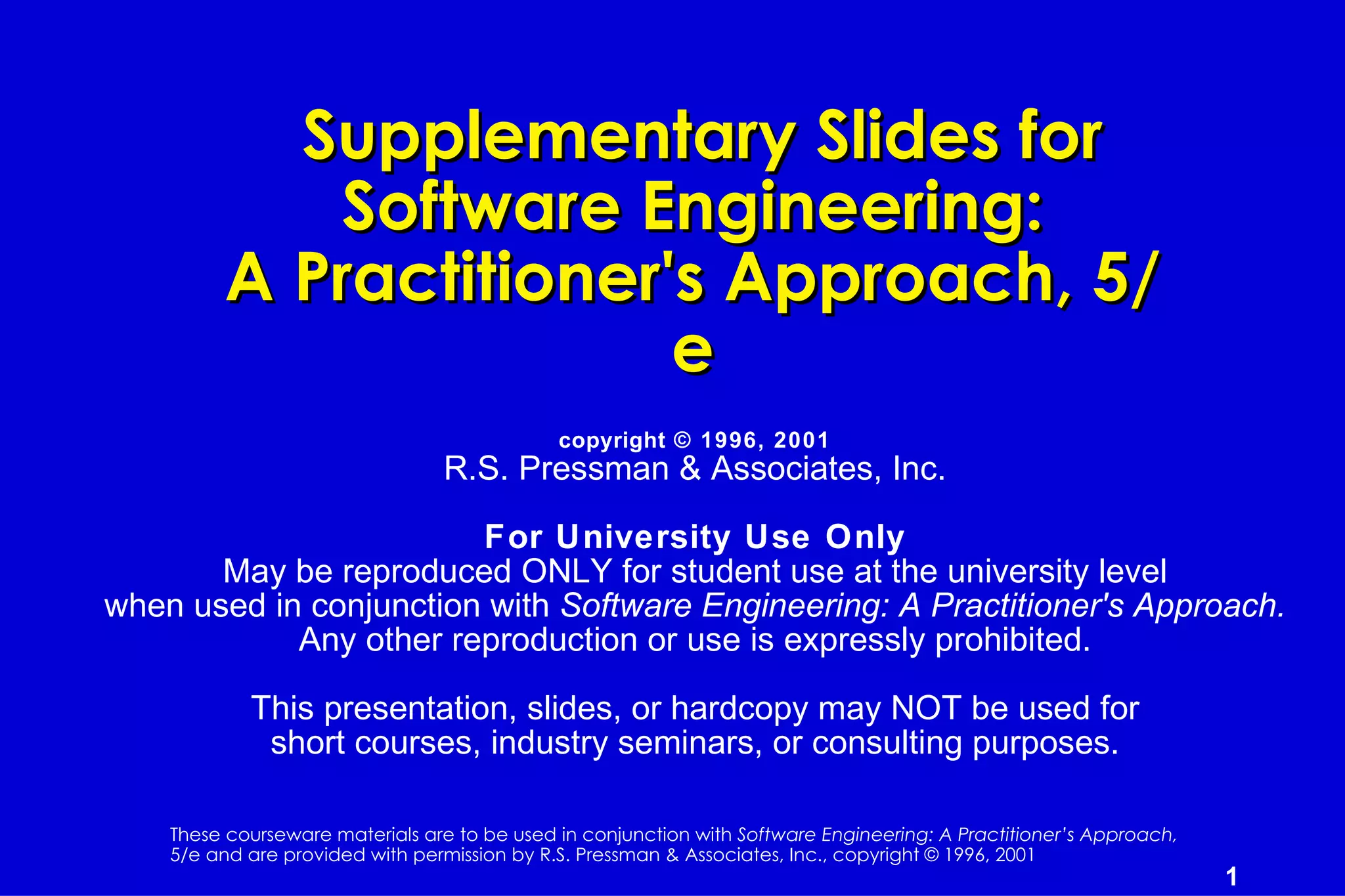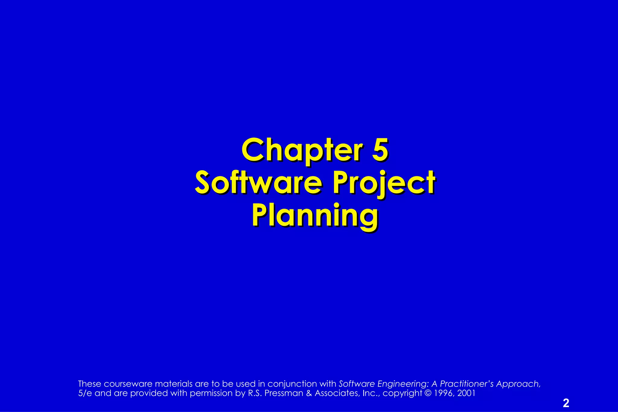 The document contains slides summarizing key aspects of software project planning from the textbook "Software Engineering: A Practitioner's Approach". It discusses establishing a project plan to control, track, and monitor a software project. The main steps of project planning covered are scoping the project, estimating effort and schedule, identifying risks, creating a schedule, and defining a control strategy. Estimation techniques discussed include past experience, task breakdowns, size metrics like lines of code and function points, and tool-based methods. The slides also cover risk analysis, the make-buy decision process, and computing expected costs.