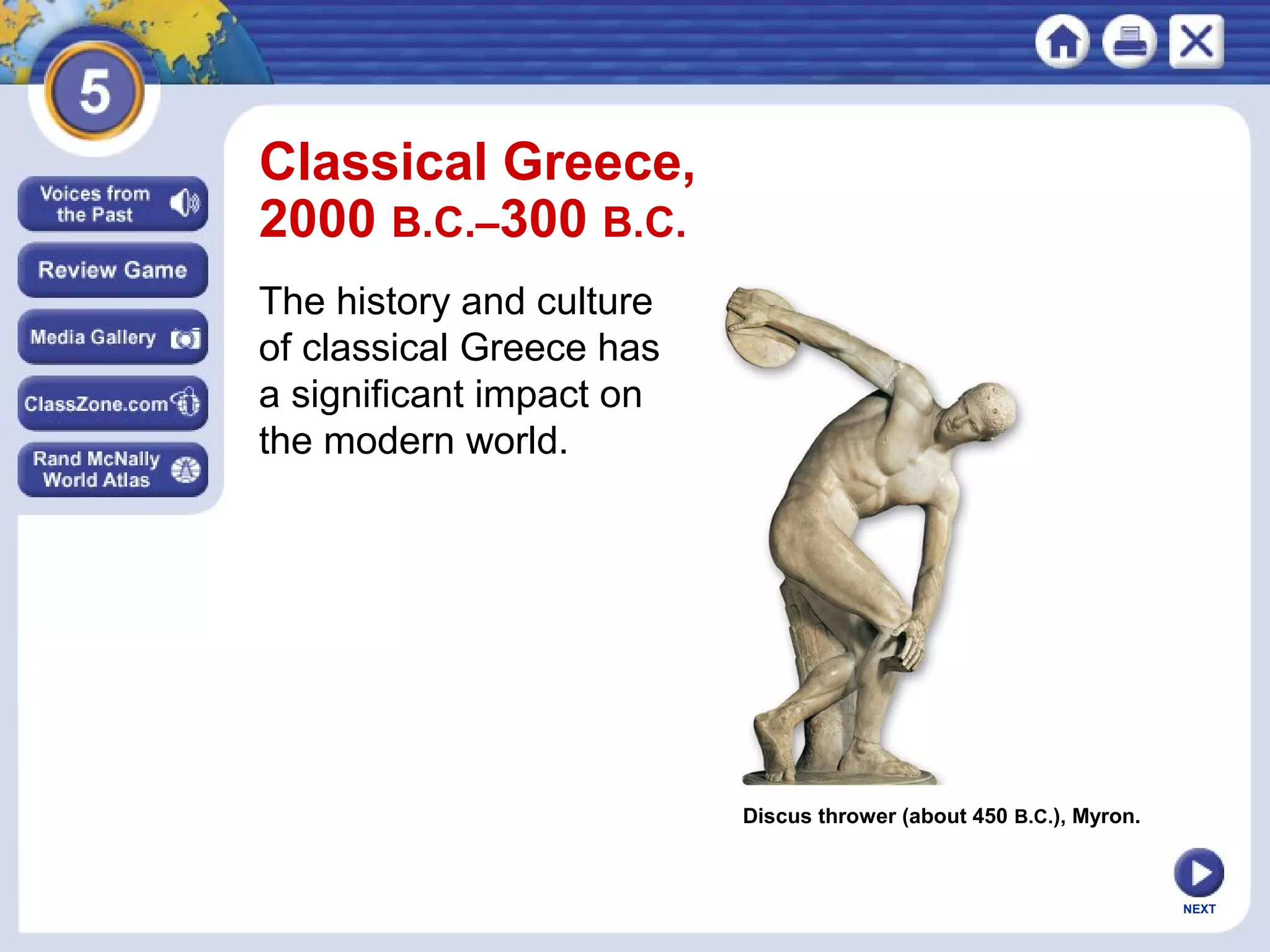 This document provides an overview of classical Greece between 2000 BC and 300 BC. It covers the major cultures that influenced Greece like the Mycenaeans, Minoans, and Dorians. It then discusses the rise of city-states and different forms of government like democracy in Athens and the military state of Sparta. The Persian Wars of the 5th century BC are described where the Greeks resisted Persian invasion. Athens entered a golden age under the rule of Pericles, with advances in art, architecture, drama, and philosophy. Eventually Sparta defeated Athens in the Peloponnesian War, though Greek culture continued to spread through Alexander the Great's later conquests.