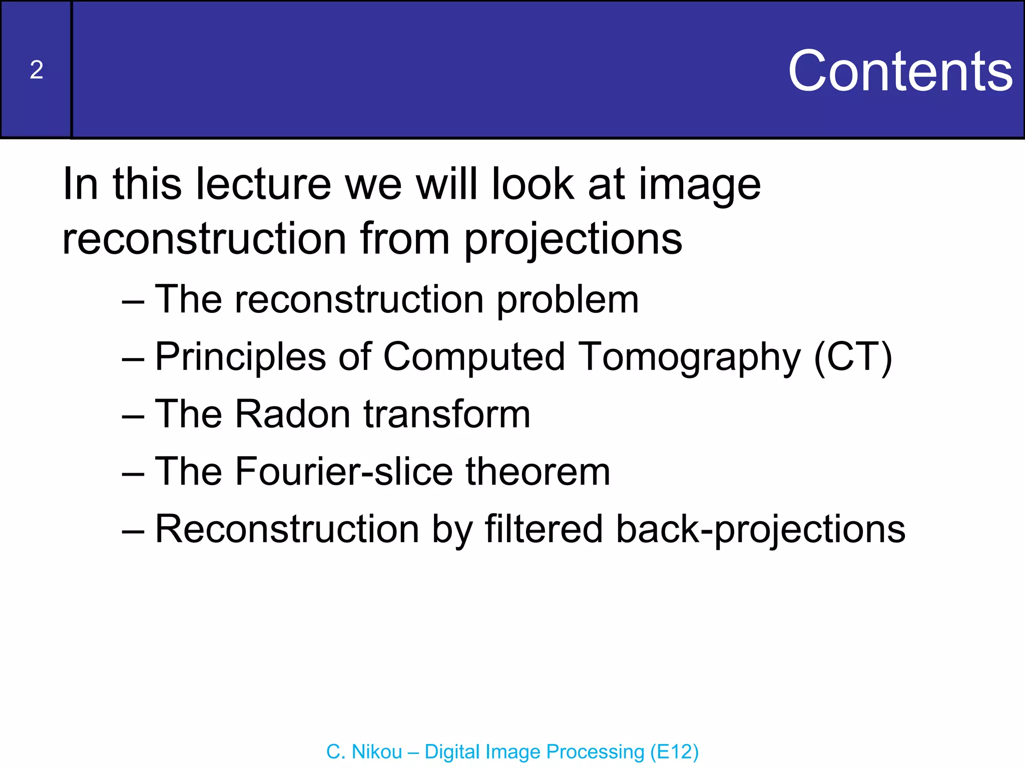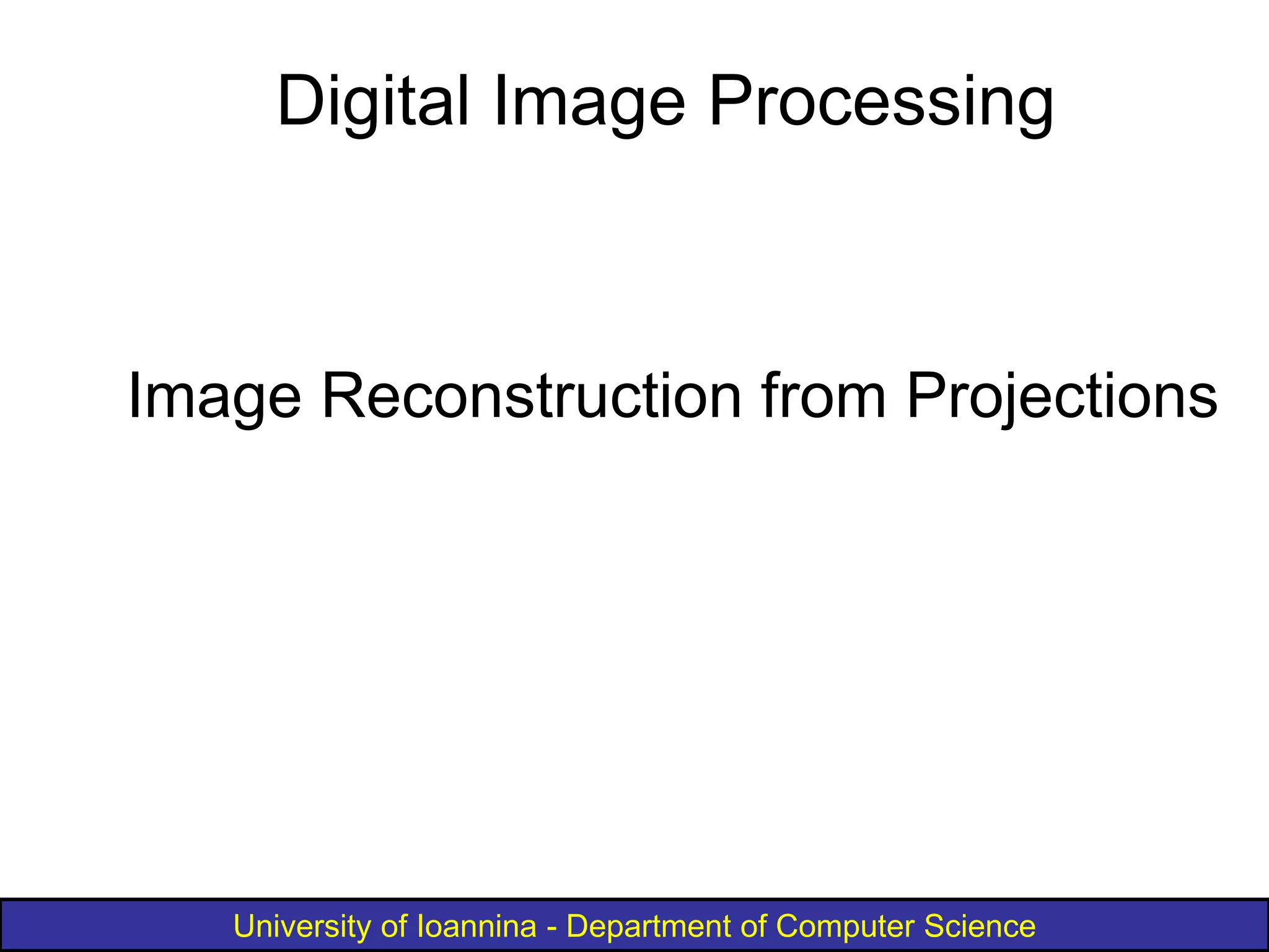 This document discusses image reconstruction from projections. It begins by introducing the image reconstruction problem and describes how taking projections from multiple angles can be used to reconstruct an image. It then covers the principles of computed tomography (CT), the Radon transform, and the Fourier-slice theorem. The key idea is that the Fourier transform of a projection is a slice of the 2D Fourier transform of the image. Finally, it describes how filtered back-projection can be used to reconstruct an image by filtering each projection with a ramp filter and back-projecting. Window functions are used to filter the ramp filter to reduce ringing artifacts.