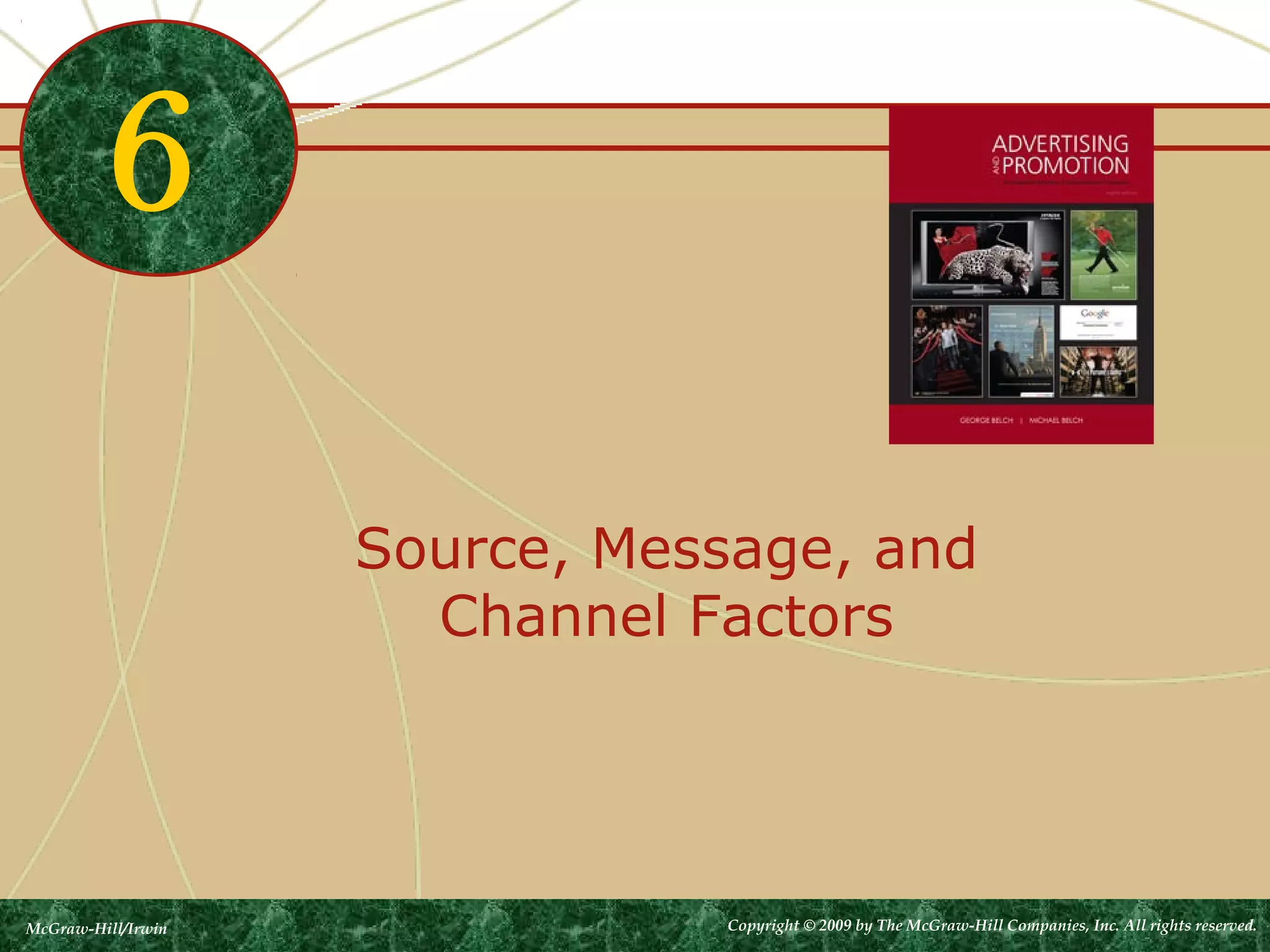 The document discusses various factors related to message sources, content, and channels in promotional planning. It provides examples of Tiger Woods' lucrative endorsement deals with Nike starting in 1996. It also shows diagrams of the persuasion matrix that outlines elements to consider, including the source's ability to gain attention, the receiver's ability to comprehend the message, and which media channels will increase message presentation and persuasiveness. Celebrities are often used as sources due to their attractiveness and ability to induce persuasion through identification, though they also carry advertising risks if their behavior affects their credibility.