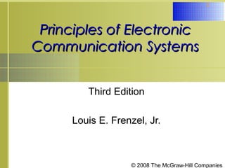 This document summarizes Chapter 6 from the textbook "Principles of Electronic Communication Systems" which covers FM circuits including frequency modulators, phase modulators, and frequency demodulators. It describes various circuit designs that can be used for frequency modulation like varactor diodes, reactance modulators, and phase modulation. It also explains common frequency demodulation techniques like slope detectors, pulse-averaging discriminators, quadrature detectors, and phase-locked loops.