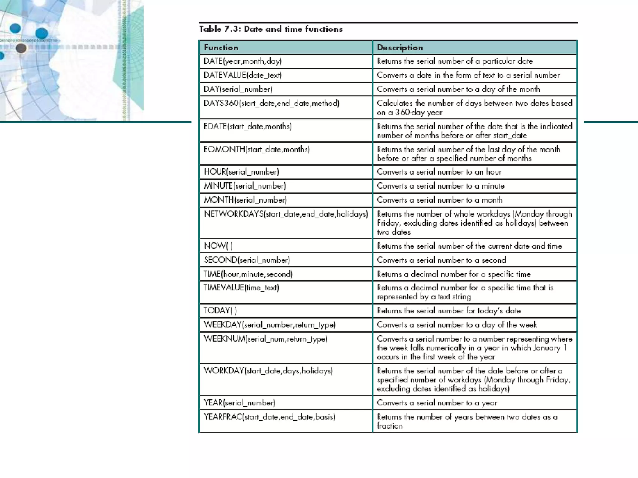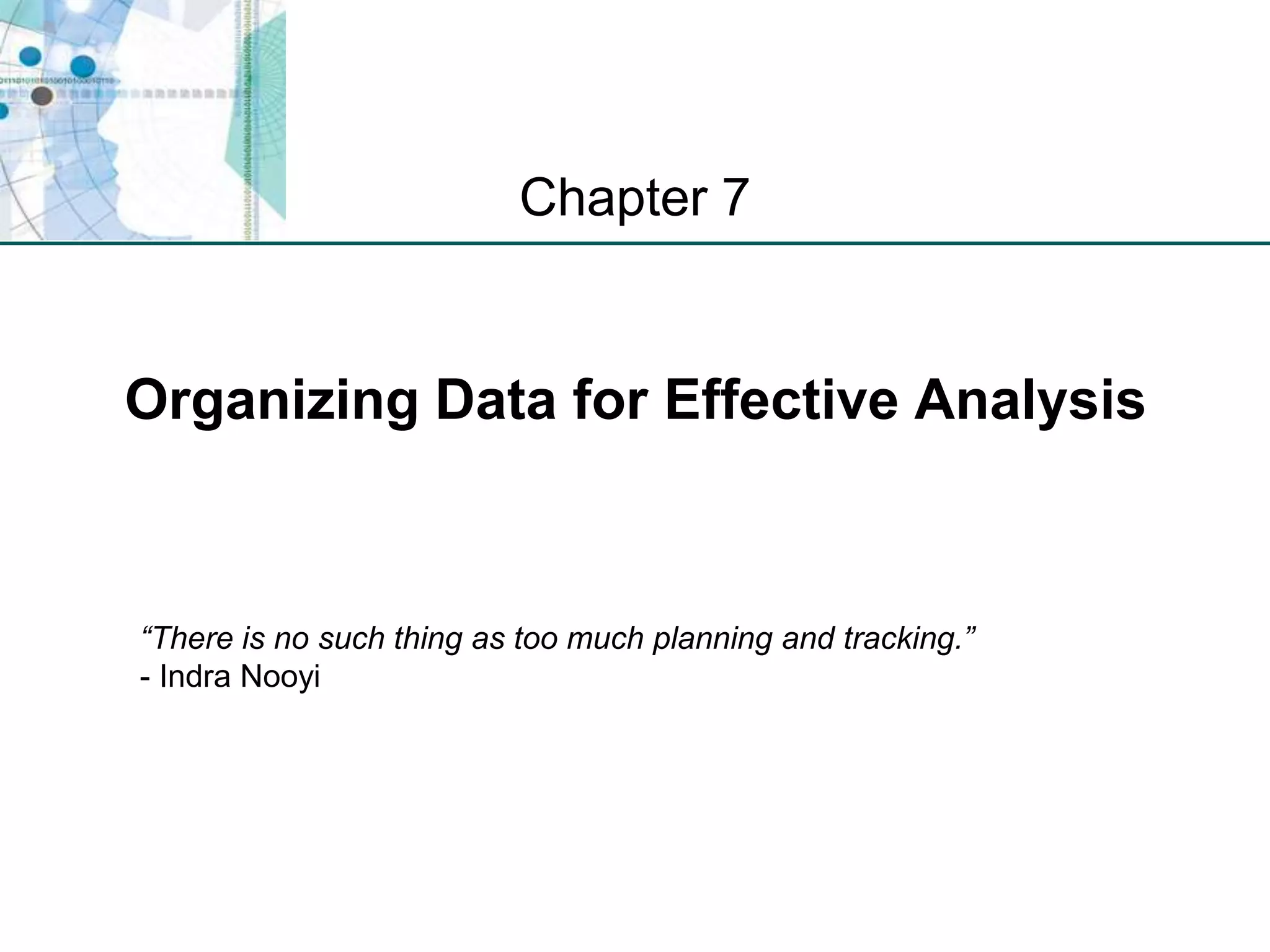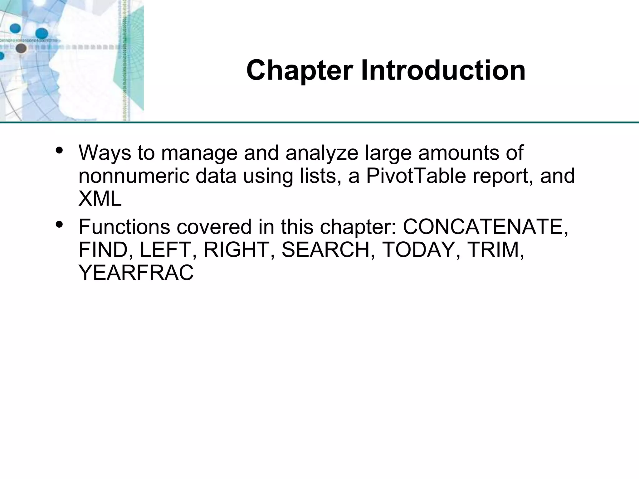 This chapter discusses organizing data for effective analysis in Excel. It covers importing and structuring text data, analyzing data imported from databases using functions like CONCATENATE and YEARFRAC, creating PivotTable reports to summarize data, and importing/exporting XML data using XML maps.