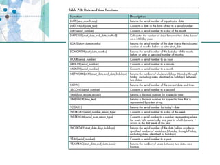 This chapter discusses organizing data for effective analysis in Excel. It covers importing and structuring text data, analyzing data imported from databases using functions like CONCATENATE and YEARFRAC, creating PivotTable reports to summarize data, and importing/exporting XML data using XML maps.