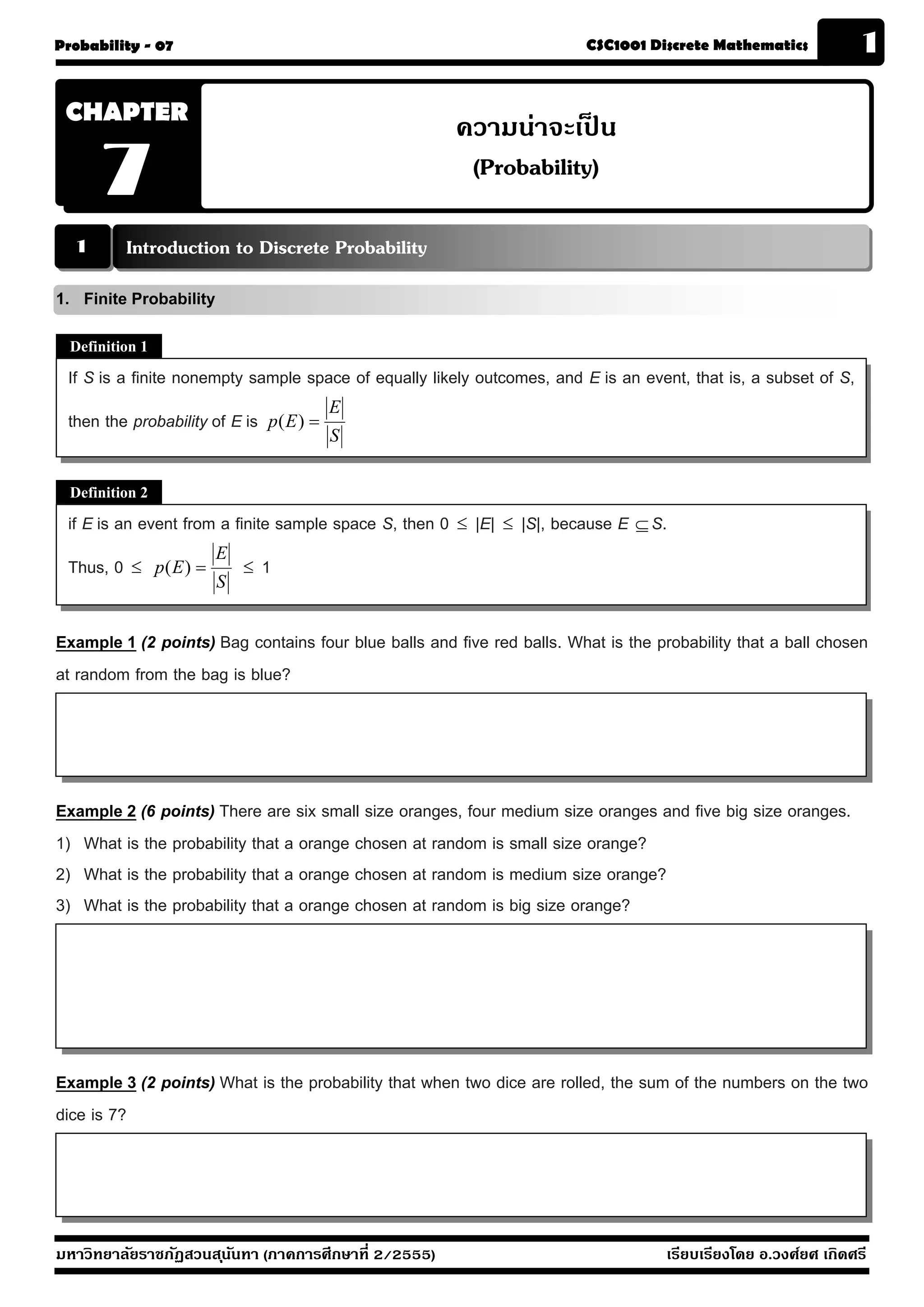 This document provides examples and definitions related to probability and expected value. It introduces key concepts like finite probability, conditional probability, independence, and expected value. Some examples calculate the probability of events like rolling dice, randomly selecting balls from a bag, and coin flips. Other examples determine if events are independent or calculate the expected number of heads from coin flips. The document aims to explain fundamental probability topics through illustrative examples.