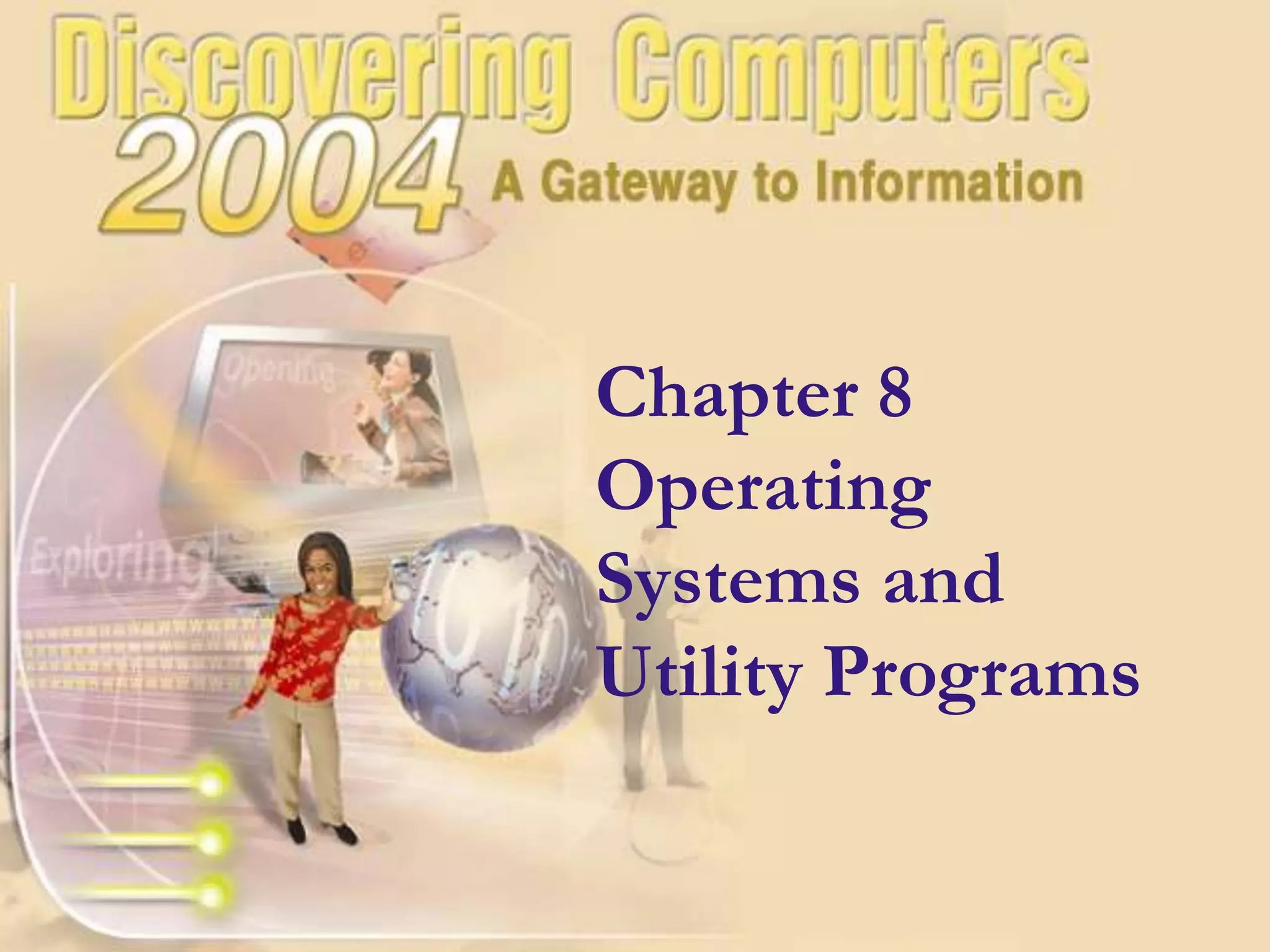 The chapter discusses system software, operating systems, and utility programs. An operating system coordinates computer hardware and software resources, provides a user interface and file management, establishes internet connections, and more. Common operating systems include Windows, Mac OS, and Linux. Utility programs perform maintenance tasks like file management, uninstalling programs, scanning disks for errors, and backing up files. The chapter also covers embedded, stand-alone, and network operating systems.