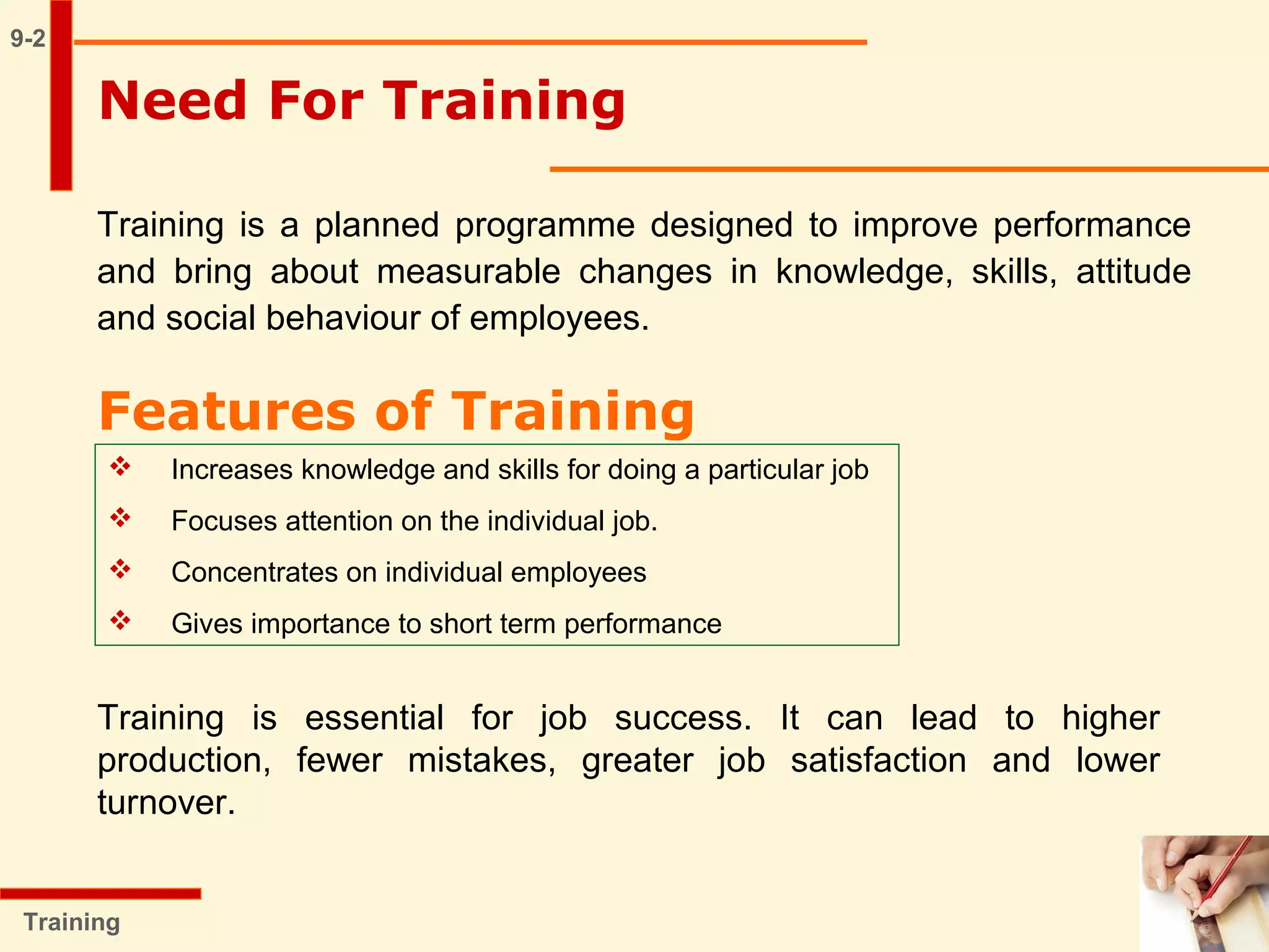 Training is a planned programme designed to improve employee performance and bring about measurable changes in knowledge, skills, attitude, and social behavior. It is essential for job success and can lead to higher production, fewer mistakes, greater job satisfaction, and lower turnover. Training helps new recruits perform tasks effectively, prepares existing employees for higher level jobs, and enables employees to keep up with latest developments and changes. A systematic approach to training involves assessing training needs, implementing training programs, and evaluating their effectiveness. Common on-the-job training methods include job instruction training, coaching, mentoring, and job rotation.