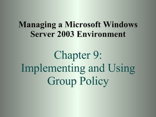 Group Policy Objects (GPOs) can be used to centrally manage user and computer settings across a Windows network. GPOs are created and linked to sites, domains, and organizational units to apply policies to all computers and users within those containers. Common uses of GPOs include controlling user desktop settings and security, deploying login and startup scripts, redirecting user folders, and installing or removing software applications. Troubleshooting tools like GPRESULT and Resultant Set of Policy can help determine which policies are in effect for a given user or computer.