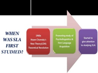 The document summarizes two case studies on second language acquisition. The first case study followed a Japanese man named Wes learning English in Hawaii over three years through naturalistic exposure. It found that while his grammar accuracy did not reach native levels, he developed communication abilities. The second case study compared two boys, J from Portugal and R from Pakistan, learning English in a classroom setting in London. It found that both were able to perform simple requests and their abilities developed sequentially despite different first languages. The studies illustrate the complexity of second language acquisition.