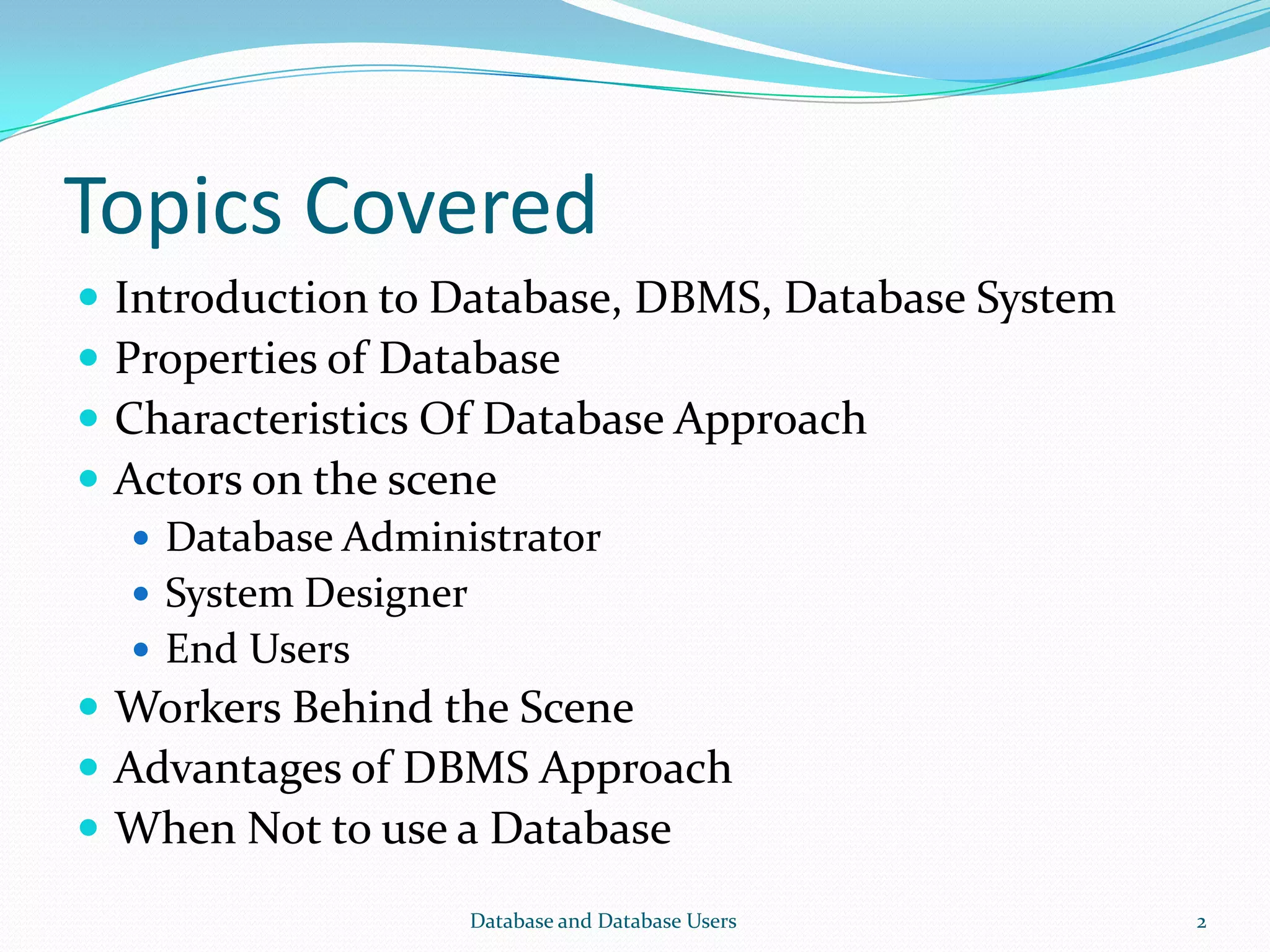 This document provides an introduction to databases and database management systems (DBMS). It discusses key concepts such as the main components and users of a database including end users, database administrators, and designers. It also summarizes the main characteristics of the database approach like data abstraction, multiple views, and transaction processing. Some advantages of using a DBMS are controlling redundancy, restricting access, and enforcing integrity constraints. The document also outlines scenarios where a DBMS may not be needed.