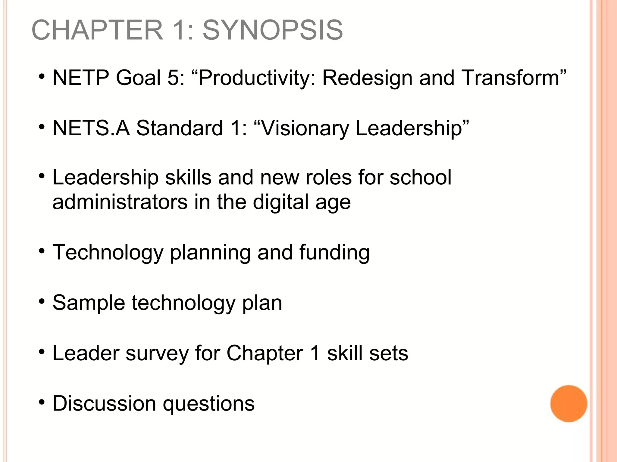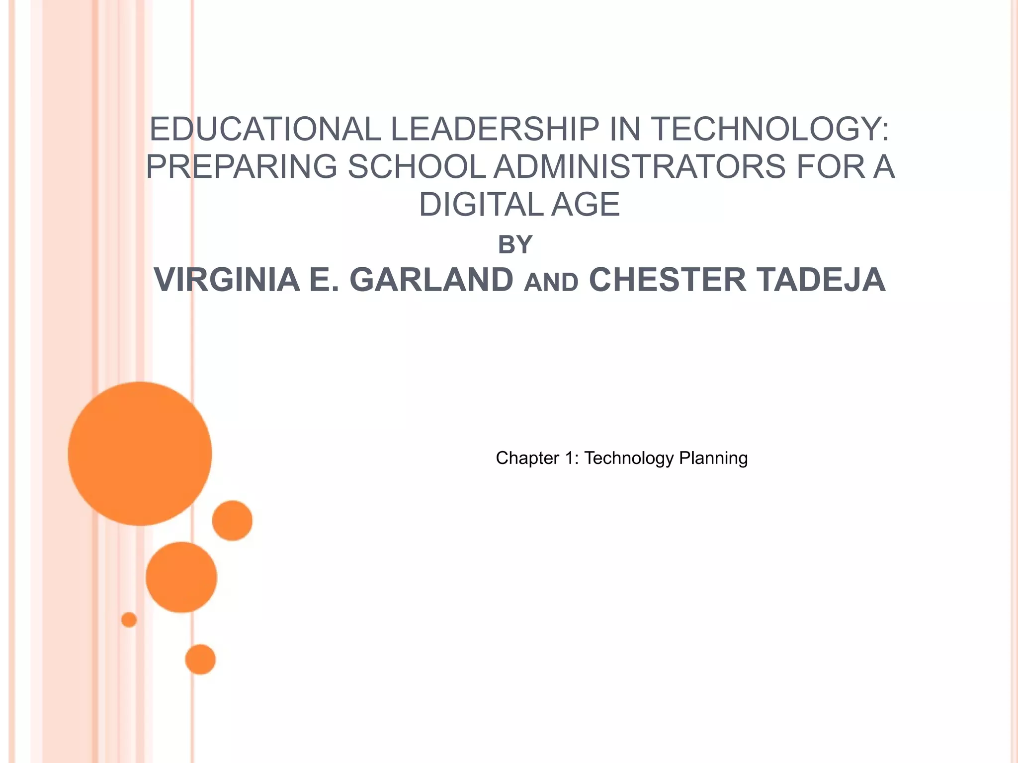 This chapter discusses the need for educational leaders to develop strategic technology plans that align with national standards and transform how technology is used for learning. It provides an overview of relevant goals and standards, the changing role of administrators, and components of an effective technology plan. Leaders are encouraged to assess their skills, get input from stakeholders, and address infrastructure and funding needs to create a plan that improves student engagement and achievement through technology integration.