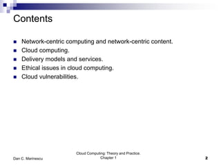 This chapter introduces cloud computing and discusses its key concepts. It describes cloud computing as a model for enabling ubiquitous, convenient, on-demand network access to a shared pool of configurable computing resources that can be rapidly provisioned and released with minimal management effort or service provider interaction. It discusses the delivery models of Infrastructure as a Service (IaaS), Platform as a Service (PaaS) and Software as a Service (SaaS). The chapter also outlines some of the benefits of cloud computing as well as challenges and ethical issues that need to be addressed for its successful adoption.