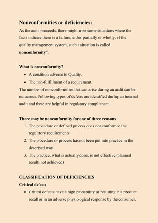 The document discusses nonconformities identified during internal audits of quality management systems, explaining three types of defects: critical, major, and minor. Critical defects pose significant risks to safety and compliance, while major defects can affect product usability without harming consumers, and minor defects have minimal impact. It lists potential causes for each type, emphasizing the importance of adherence to regulatory requirements and proper operational practices.