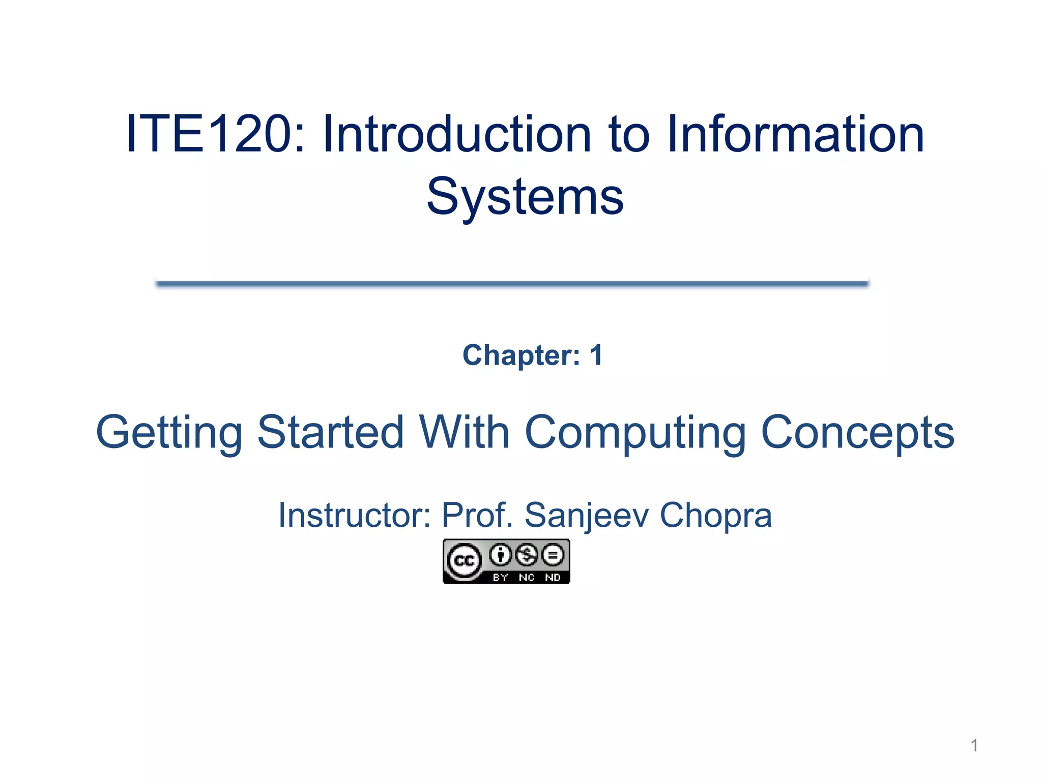 This document provides an introduction to computing concepts, including identifying hardware components like keyboards and monitors, accessing the internet, and ensuring security. It discusses how data is turned into information through processing and defines operating systems, applications, and system software. The objectives are to understand basic hardware, software, internet use, sharing resources, and security.