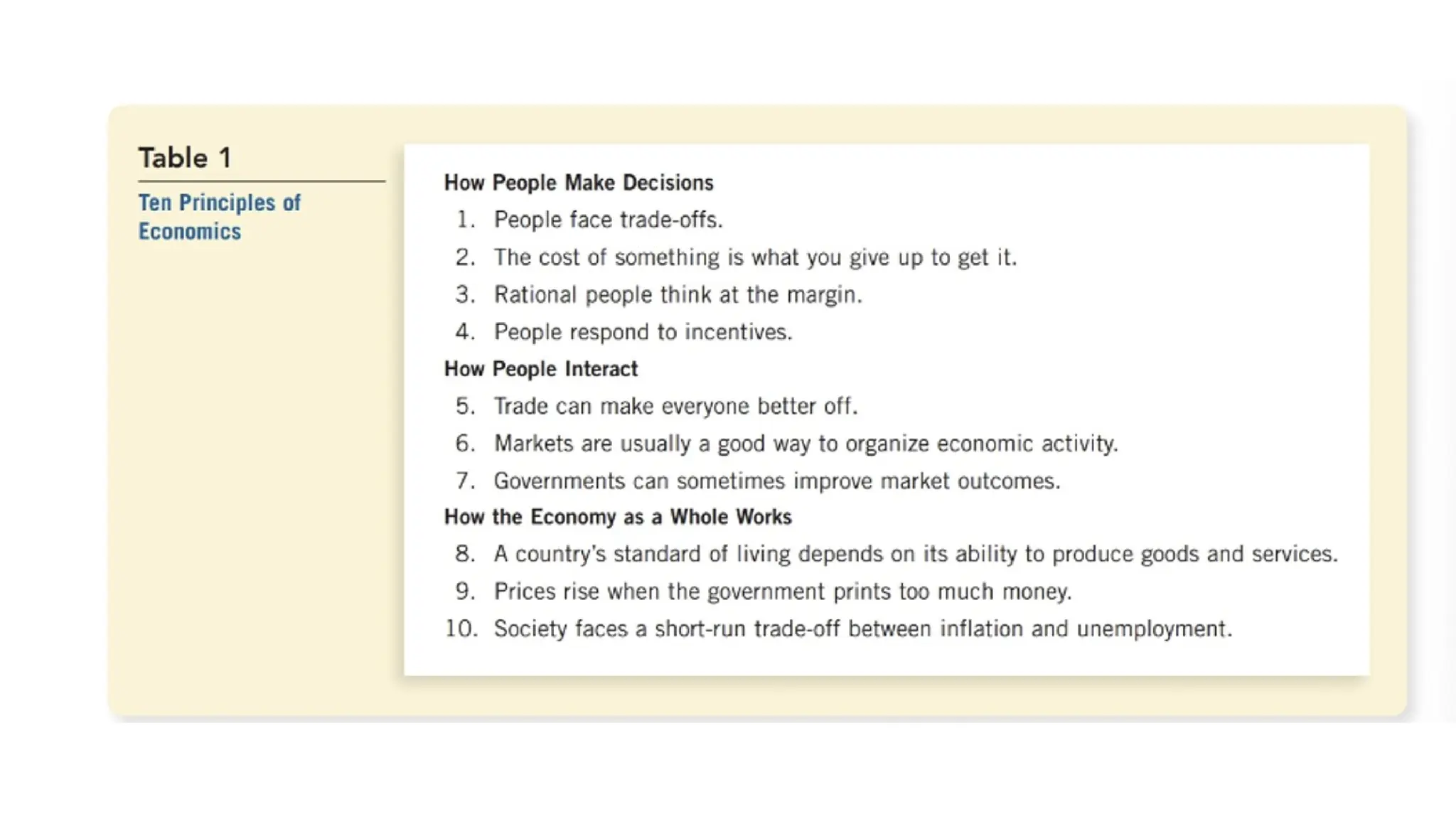 The document presents ten principles of economics, emphasizing the management of scarce resources in society. Key concepts include trade-offs, marginal thinking, and the role of incentives, trade, and government in economic interactions. It also highlights the relationship between a country's production capabilities, money supply, and the trade-off between inflation and unemployment.