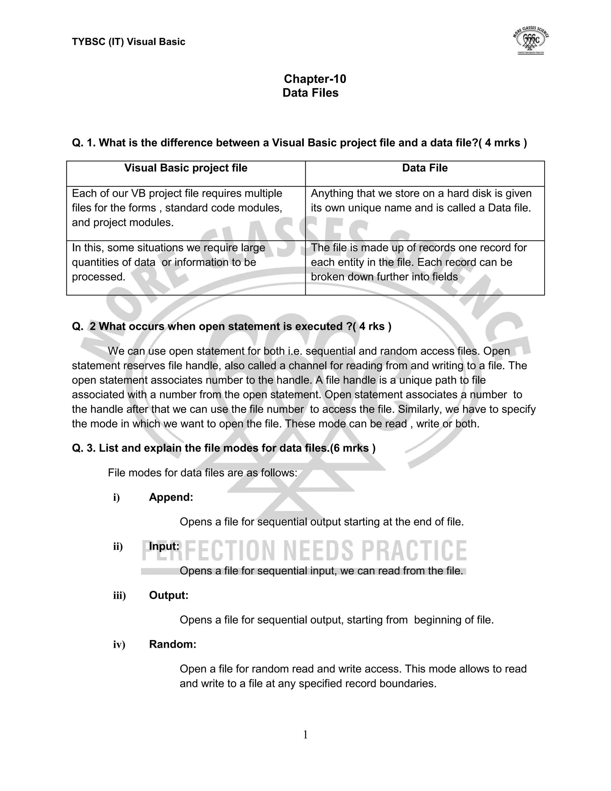 The document discusses data files in Visual Basic. It provides 12 questions with explanations about key concepts related to data files, including: