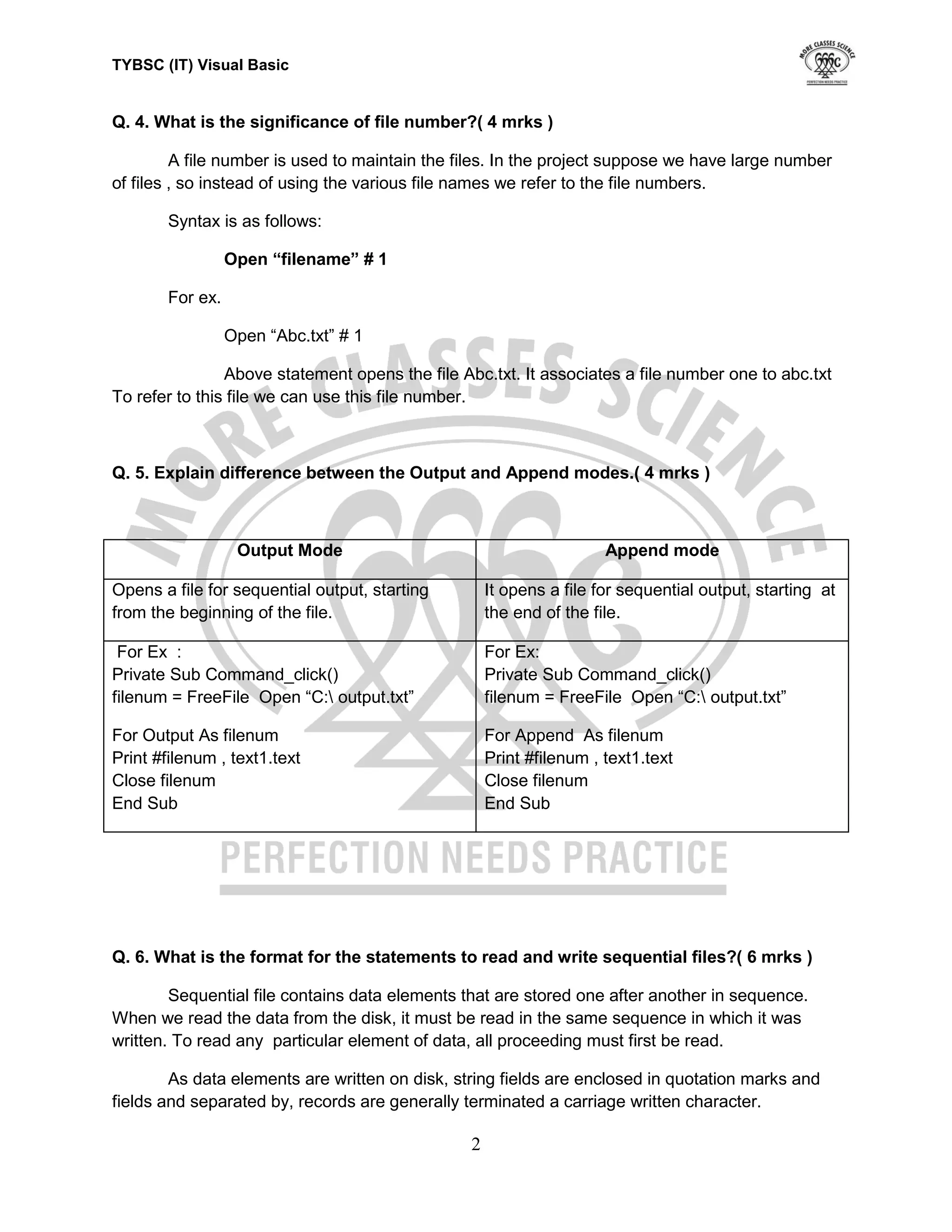 3) Common file modes are input, output, append, and random for different types of file access.