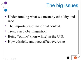 This document summarizes key concepts from Chapter 10 of Essentials of Sociology regarding ethnicity and race. It defines ethnicity as referring to the distinct cultural norms of a social group, including shared history, religion, ancestry, language, and sense of destiny. Race is defined as an externally imposed system of social categorization based on physical characteristics. Racialization is the actual imposition of a racial schema on a society. Racism involves prejudice and discrimination based on physical differences. The document then discusses models of ethnic coexistence in the US, global migration trends, and how to see racial and ethnic inequality in areas like education, income, and wealth.