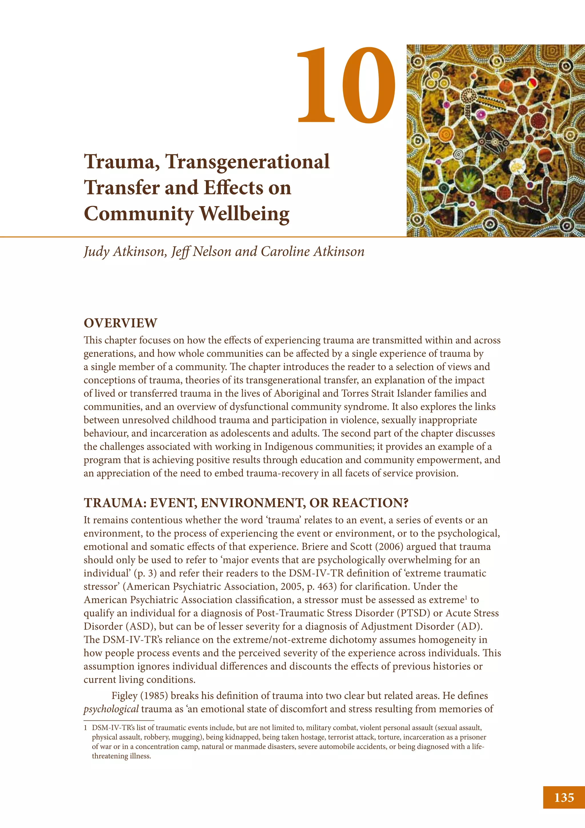 This document discusses how trauma experienced by individuals can be transmitted across generations and negatively impact entire communities. It defines trauma and explores theories of its transgenerational transfer. Experiencing or being exposed to unresolved trauma is linked to increased rates of family violence, substance abuse, mental health issues, and criminal behavior in subsequent generations. Government policies are also discussed as exacerbating trauma and community dysfunction in Indigenous communities in Australia. The transmission of historical trauma through cultural and family systems helps explain the phenomenon of "dysfunctional community syndrome" seen in some Indigenous communities with high levels of compounded, unresolved trauma.