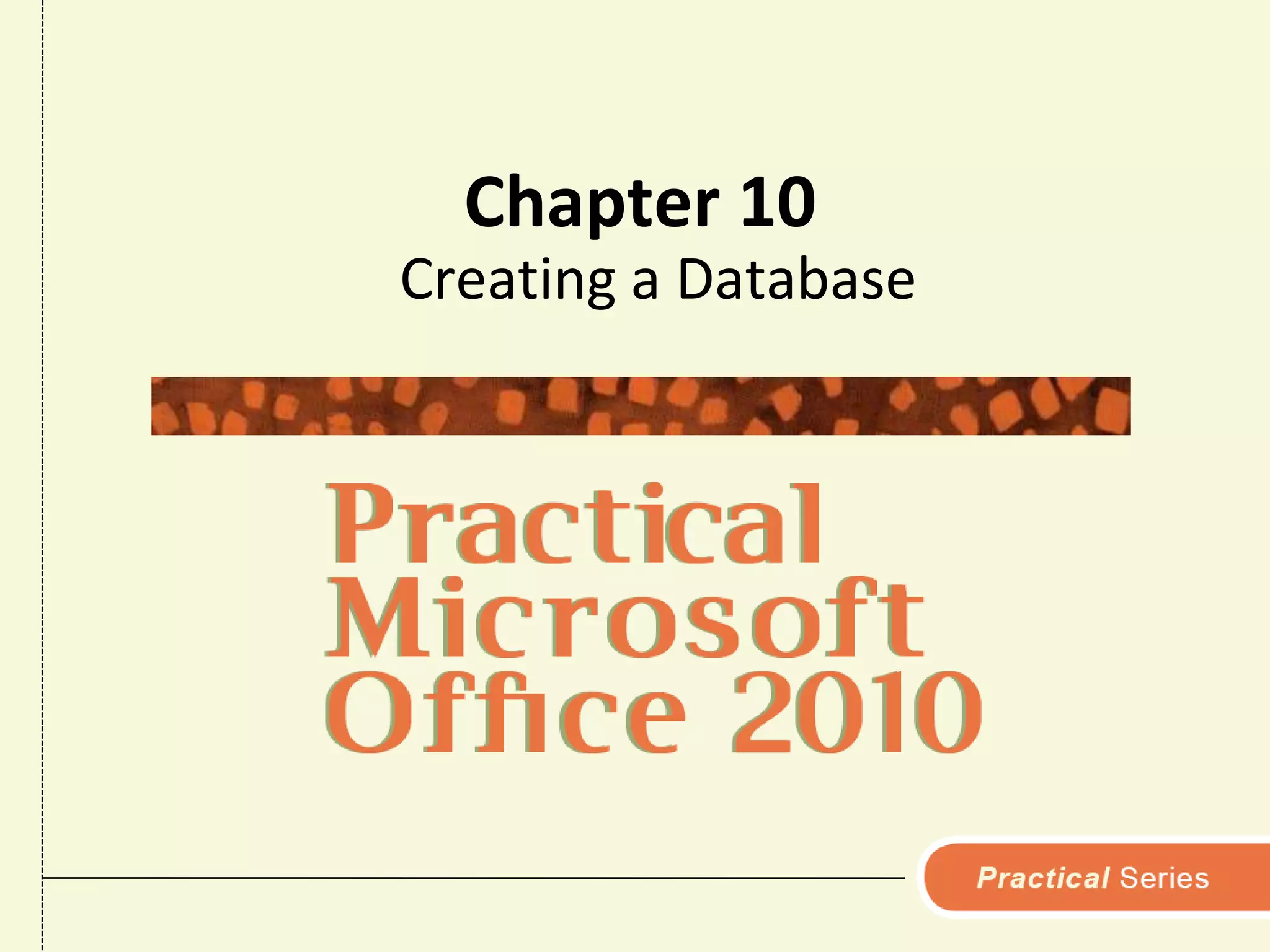 This chapter discusses how data is organized in an Access database using tables, records, and fields. It also covers how to create and work with tables, enter and edit data, import data, and create simple queries using the Query Wizard to search and filter data in the tables. Creating queries allows the user to specify criteria to locate specific records in the tables based on field values.