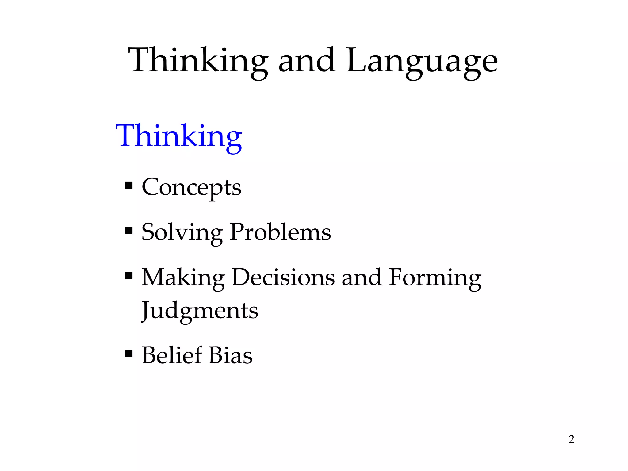 The document discusses concepts related to thinking and language. It covers topics such as concepts, problem solving, decision making, belief bias, language structure, language development in children, and thinking in different animal species. The relationship between thinking and language is also explored, with language said to influence how people think.