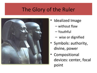 This document discusses how rulers throughout history have used art to portray themselves and project power. Royal portraits often depicted leaders as youthful, wise, and dignified to idealize their image. Grand architecture and symbolic art in places of power communicated authority. Art also depicted warriors and fortifications to convey a ruler's military strength. Historical war scenes documented battles but presented them as glorious events from the victor's perspective. More recently, some artists have portrayed the realism and human costs of war to provide alternative perspectives. In conclusion, the document questions how art serves political interests and how politics have influenced artistic depictions of war.