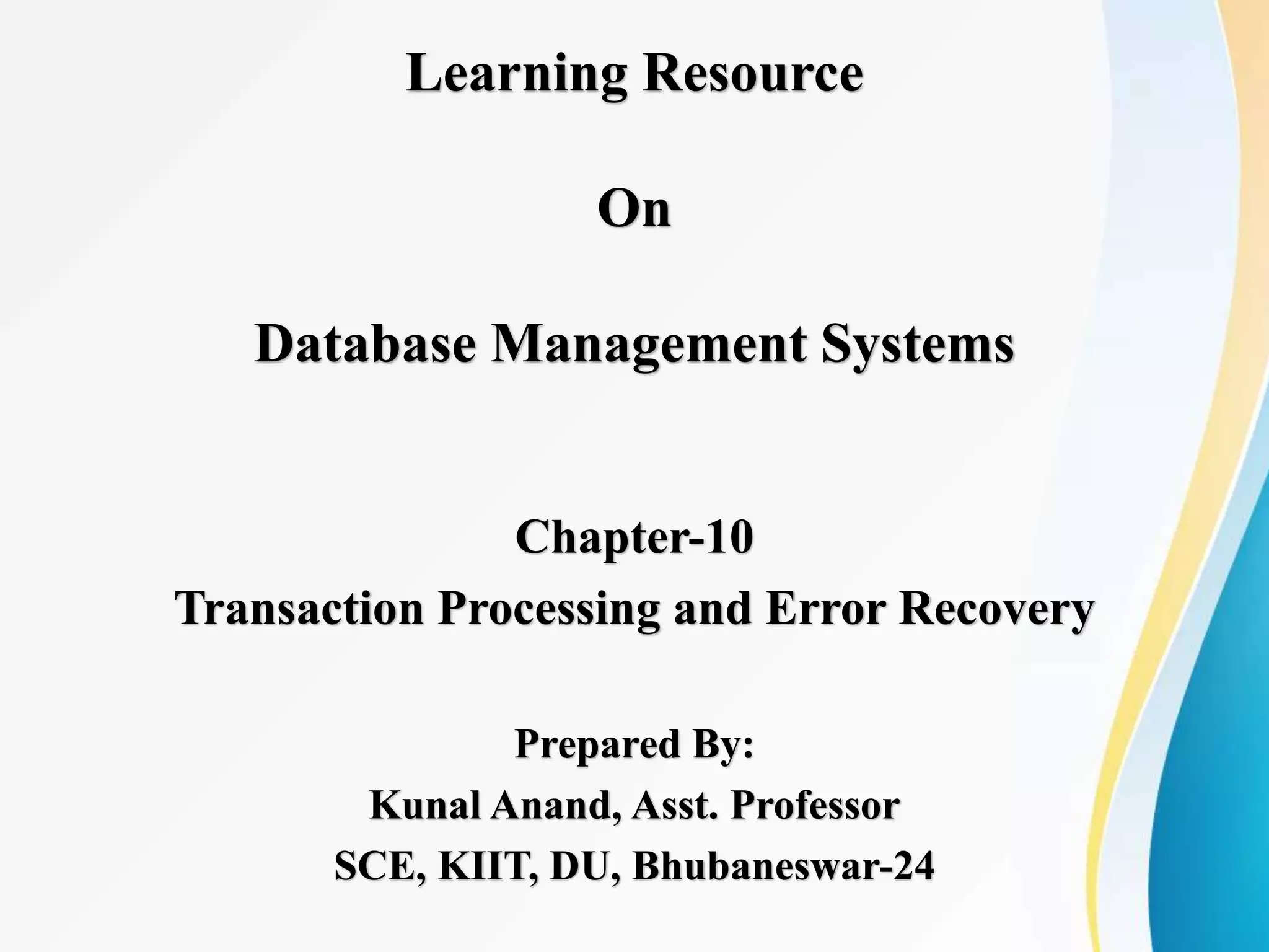The document covers Chapter 10 of a learning resource on database management systems, focusing on transaction processing and error recovery. It outlines key learning outcomes, including definitions of transactions, ACID properties, transaction states, concurrent execution, and concurrency control techniques. Additionally, it discusses various recovery techniques and provides examples to illustrate these concepts.