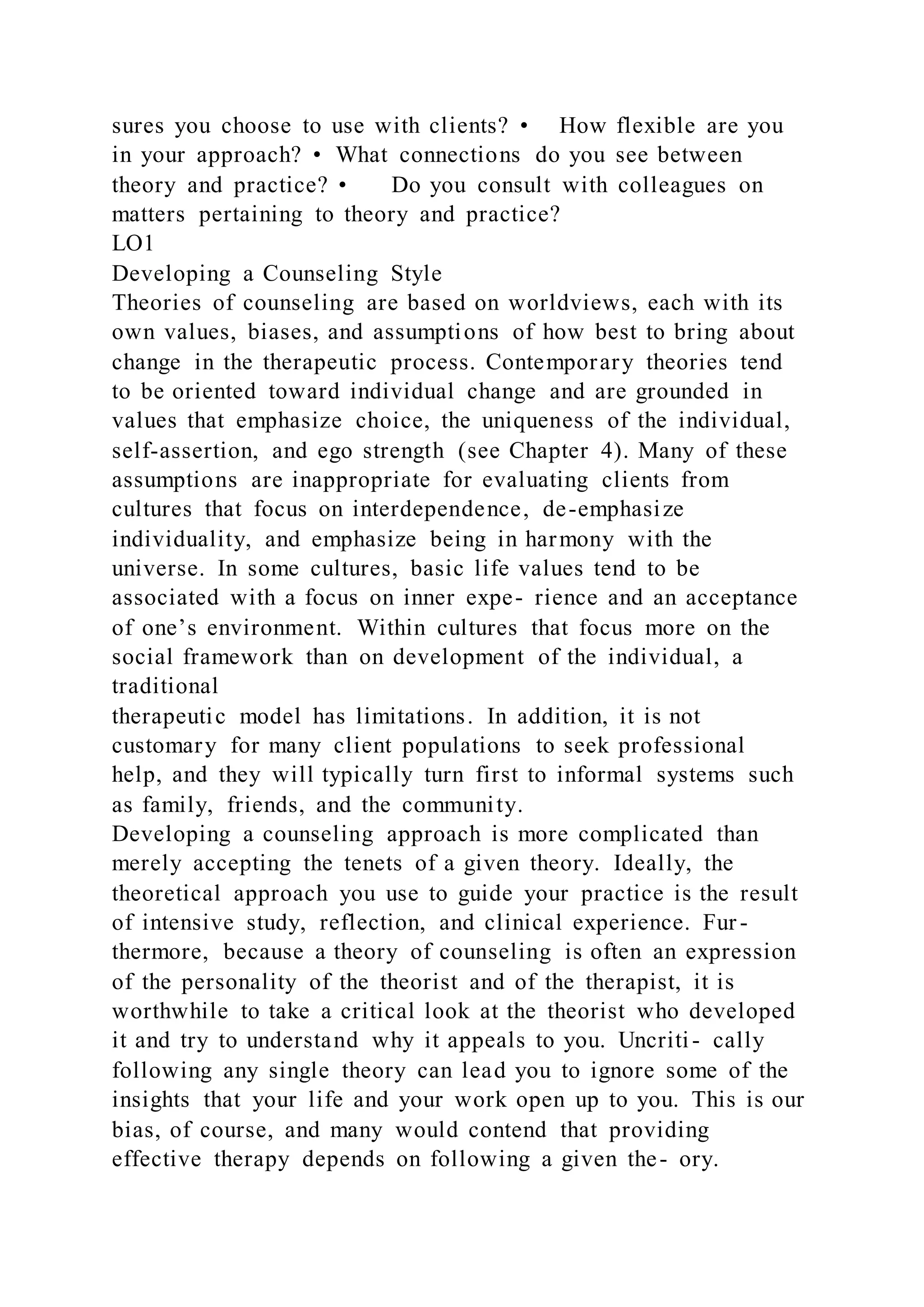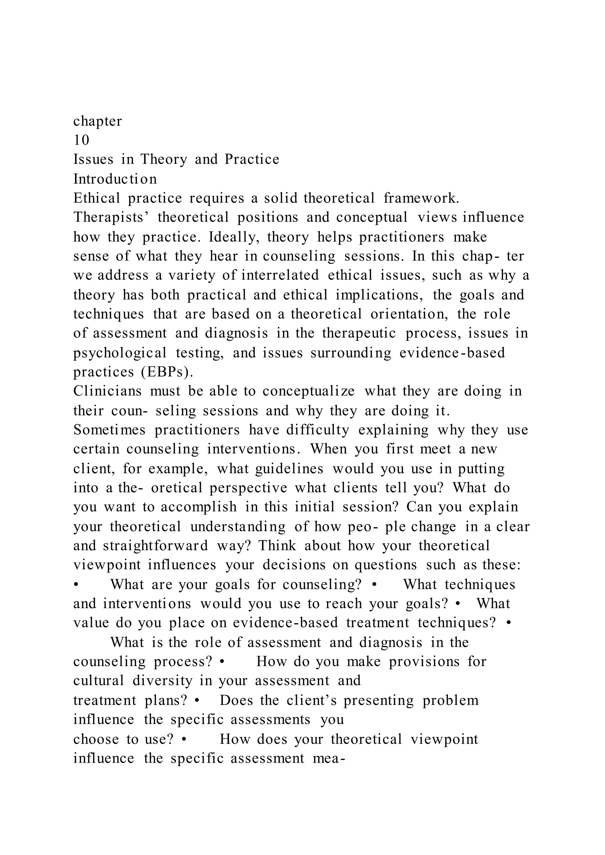 Chapter 10 addresses the ethical implications of theoretical frameworks in therapy, emphasizing the importance of a systematic approach for counselors to guide their practice. It discusses how practitioners should develop a counseling style that reflects their theoretical orientation while considering cultural diversity and client involvement in goal-setting and responsibilities within the therapeutic relationship. The chapter highlights that the therapeutic alliance and the techniques used should be rooted in a clear understanding of their purpose and contextual appropriateness for effective outcomes.