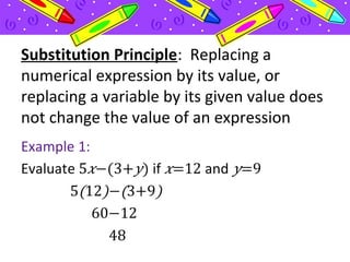 Variables are symbols that represent numbers, expressions are mathematical phrases that can contain numbers or variables. Simplifying an expression replaces it with an equivalent expression having as few terms as possible using the substitution principle and order of operations without changing the value. A formula uses variables, expressions, and the order of operations.