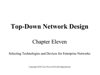 This document discusses selecting technologies and devices for enterprise networks. It covers remote access technologies like PPP, ISDN, cable modems and DSL. For WANs it discusses leased lines, SONET, Frame Relay and ATM. Selection criteria for remote access devices, VPN concentrators, routers and WAN service providers are provided. Key factors include business needs, cost, performance, security, manageability, supported protocols and geographical coverage.
