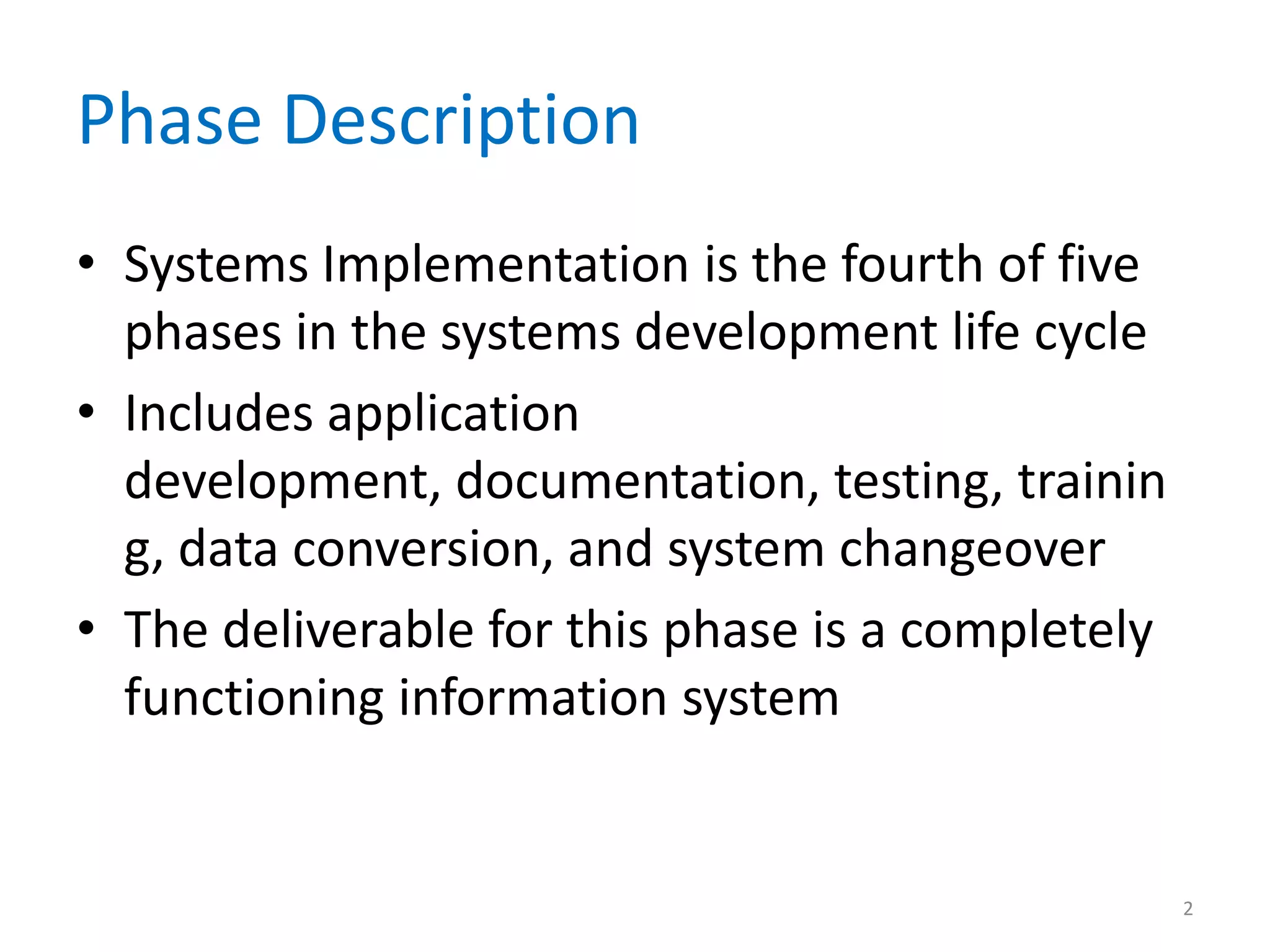 The document summarizes key points from Chapter 11 of a systems analysis textbook. It discusses the systems implementation phase, which includes application development, testing, training users, converting data, and installing the new system. It also covers post-implementation tasks like evaluating the new system and presenting a final report to management. The chapter objectives are to explain various implementation and testing processes, as well as techniques for training, converting data, installing systems, and evaluating results.