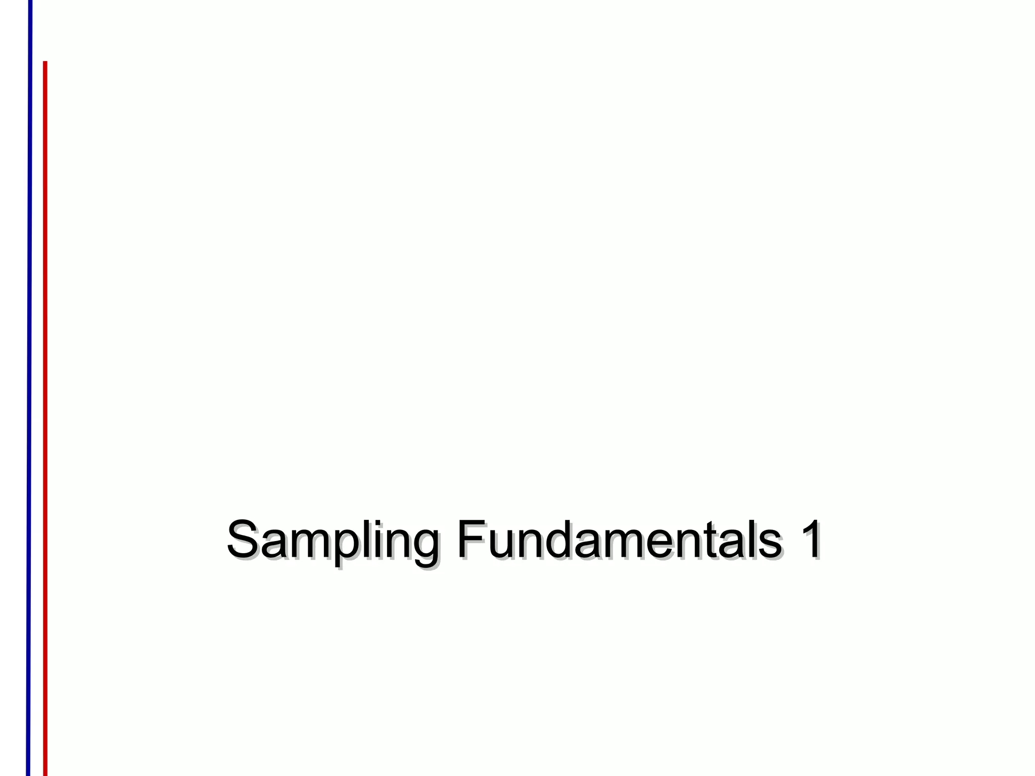 This document discusses sampling fundamentals and different sampling methods. It begins by defining key terms like population, sample, census, and parameter/statistic. It then explains that the goal of sampling is to select a sample that is as representative of the population as possible in order to make accurate inferences. The document discusses probability and non-probability sampling methods. It provides details on specific probability methods like simple random sampling, stratified sampling, cluster sampling, and systematic sampling. It also briefly outlines non-probability sampling techniques and their uses and benefits.