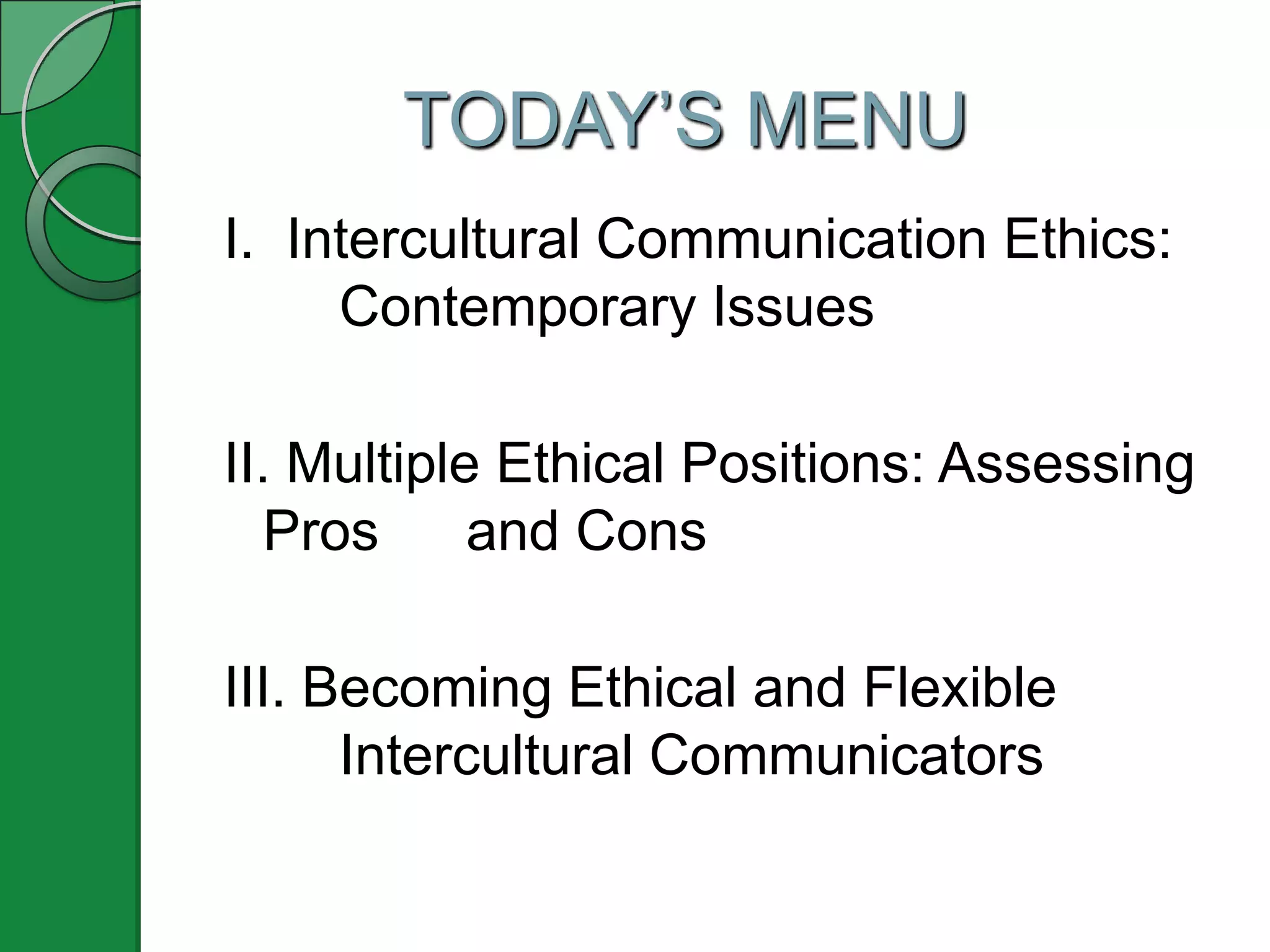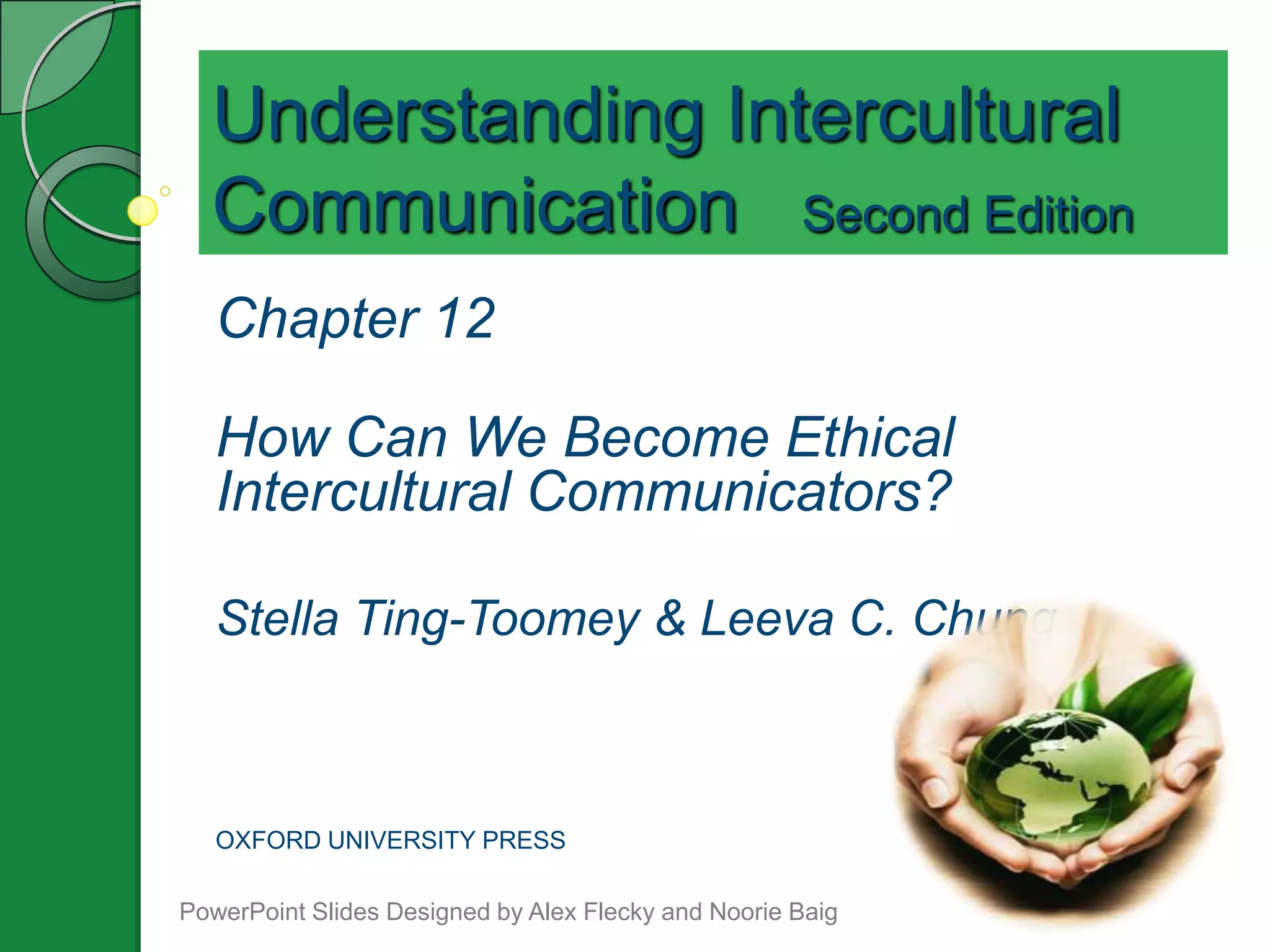 This document summarizes Chapter 12 of the book "Understanding Intercultural Communication Second Edition" which discusses how to become ethical intercultural communicators. [1] It outlines three ethical positions - absolutism, relativism and universalism - and their pros and cons for assessing ethical issues across cultures. [2] It also presents a fourth alternative position called "meta-ethics contextualism" which emphasizes fact-finding and layered interpretations of ethical dilemmas. [3] Finally, it discusses the importance of flexibility, parallel thinking and taking responsibility to communicate ethically with culturally different others.