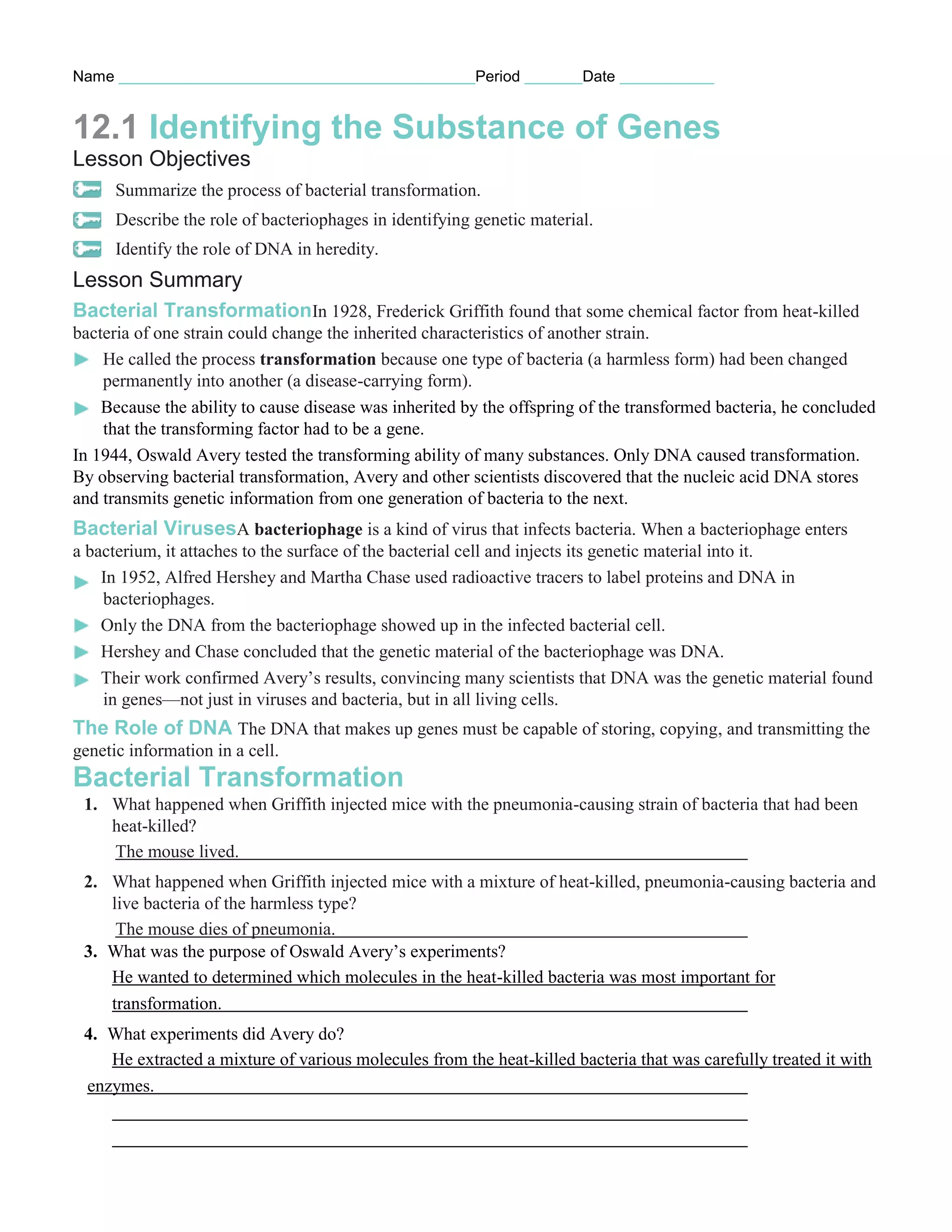 - Bacterial transformation occurs when DNA from heat-killed bacteria alters the inherited traits of living bacteria. Griffith and Avery discovered that DNA is the transforming factor that carries genetic information.