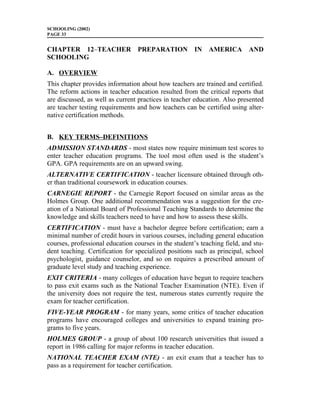 This document provides an overview of teacher preparation in the United States. It discusses the criticisms of teacher education programs, such as low admission standards, and reforms initiated in response, like expanding programs to five years. It also covers topics like teacher certification requirements, alternative certification, and definitions of key terms related to the teacher preparation process.