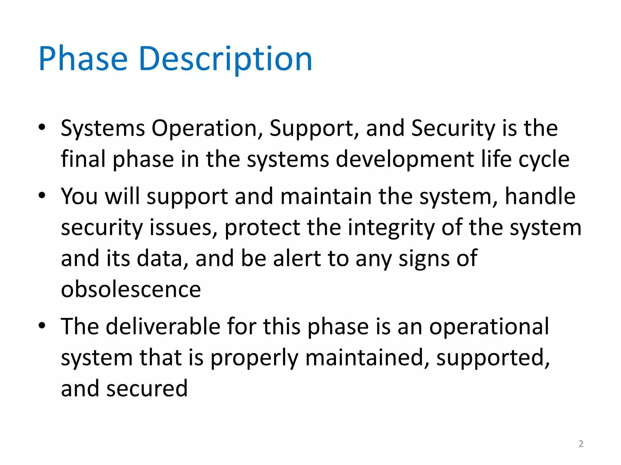 This chapter discusses the systems support and security phase of the SDLC. It covers maintaining and supporting operational systems, including user support, maintenance tasks, performance management, security, backups and disaster recovery. The chapter also addresses future challenges like system obsolescence and outlines strategies for IT professionals to advance their careers through certification.