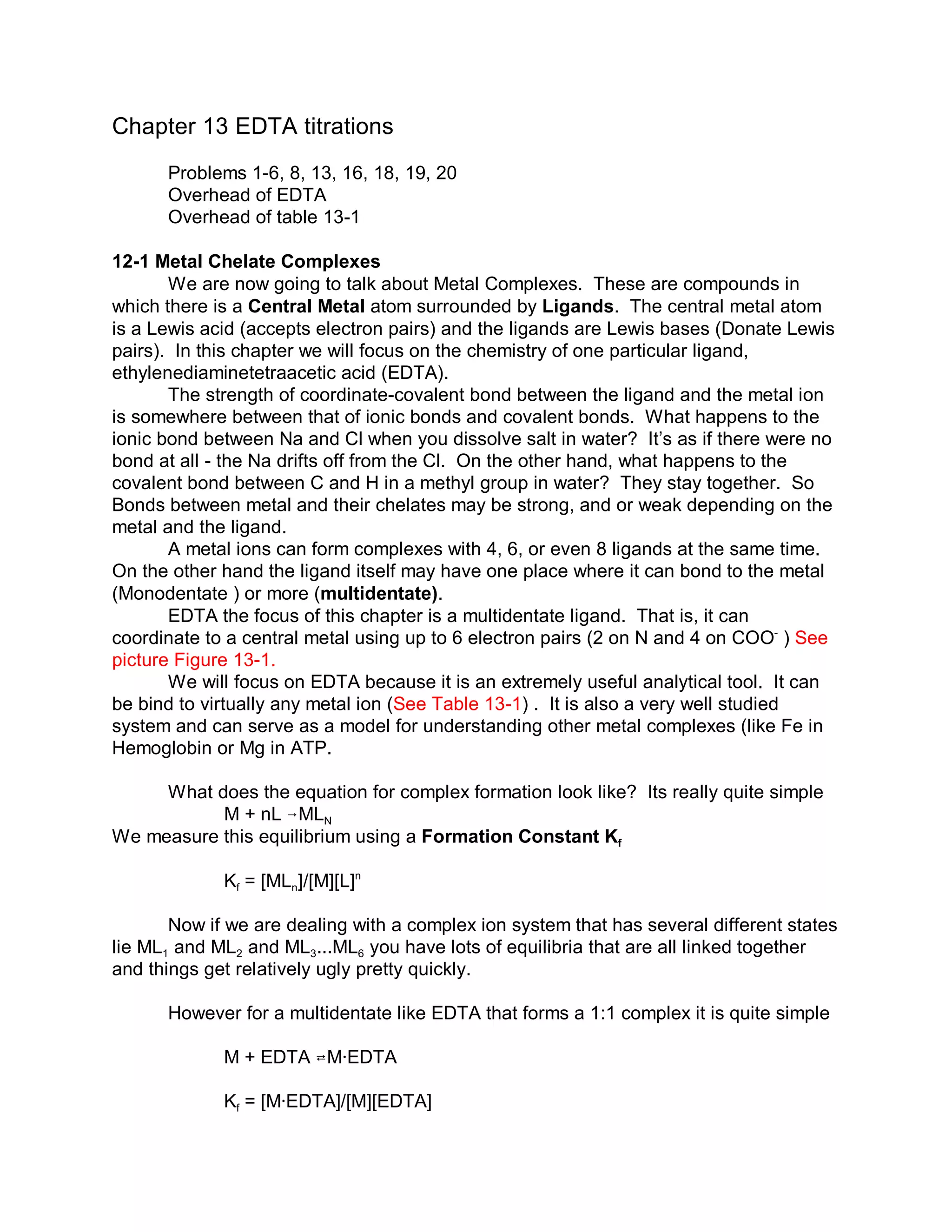 2) Key concepts covered include the chelate effect whereby multidentate ligands like EDTA form very strong complexes with metal ions. The document also discusses factors that affect EDTA titrations like pH and conditional formation constants.