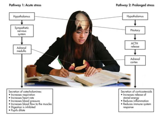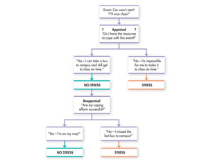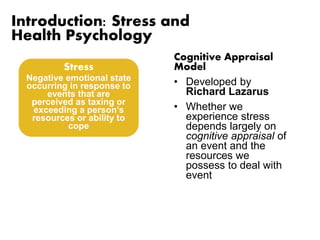 The document summarizes key concepts from a lecture on stress, health, and coping. It discusses Richard Lazarus' cognitive appraisal model of stress, sources of stress like daily hassles, life events, trauma, and social/cultural factors. It also covers physiological effects of stress like the fight-or-flight response and telomere shortening. Individual differences in coping styles, explanatory styles, and social support are reviewed, as well as gender differences in stress responses.
