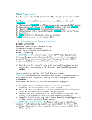 This document provides information about RNA, transcription, translation, and gene regulation. It begins by contrasting the structures of RNA and DNA, explaining the three main types of RNA, and describing the process of transcription. It then discusses the genetic code, how translation works using tRNAs and ribosomes to assemble amino acids into proteins, and the central dogma of molecular biology. The document concludes by covering gene regulation in prokaryotes and eukaryotes, including how operons control gene expression and how transcription factors regulate development.