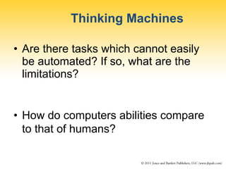 Artificial intelligence (AI) aims to model human intelligence using computers. While computers excel at tasks like calculations, humans are better at tasks requiring perception, creativity and common sense. AI techniques include expert systems that apply rules to solve problems, neural networks modeled on the brain, and natural language processing to allow communication. Robots use sensors to perceive their environment and behaviors or planning to navigate it. While progressing, AI still faces challenges replicating general human intelligence and common sense reasoning.