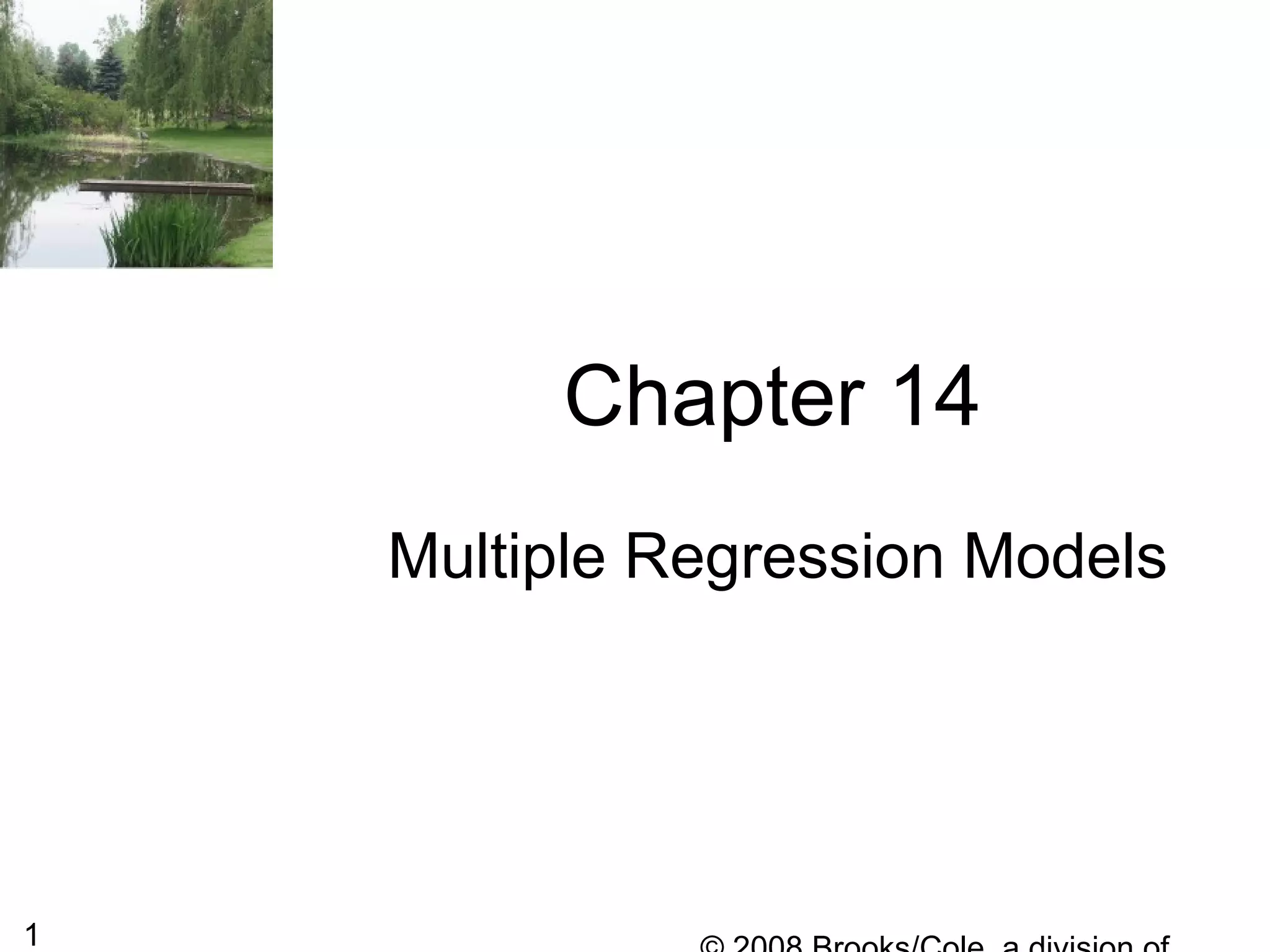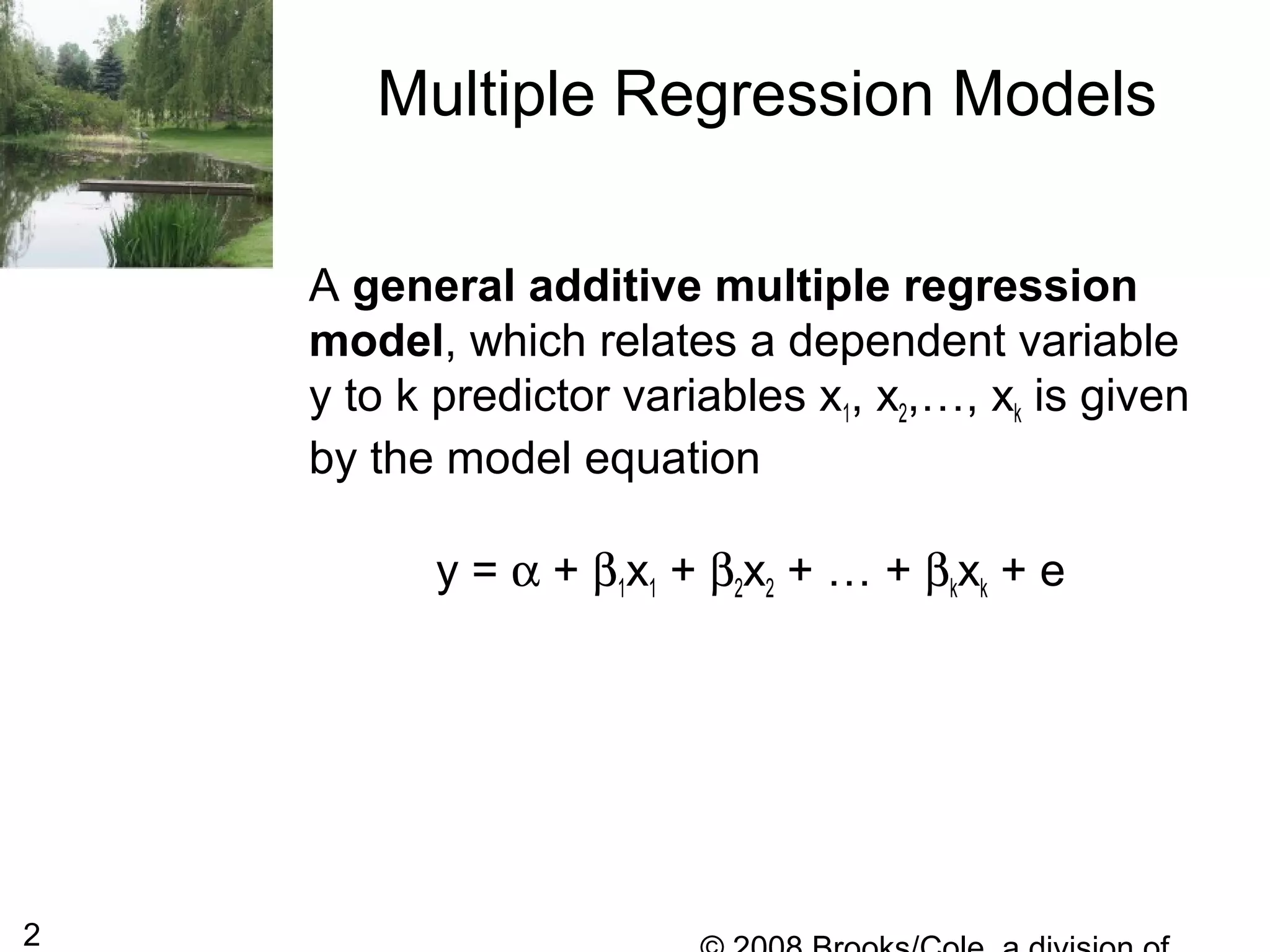 The document describes multiple regression models and their applications. It begins by defining a general multiple regression model that relates a dependent variable to multiple predictor variables. It then discusses key aspects of multiple regression models like regression coefficients, the regression function, polynomial regression models, and qualitative predictor variables. The document provides examples of applying multiple regression to model lung capacity based on variables like height, age, gender, and activity level. It describes building different regression models and evaluating their fit and significance.