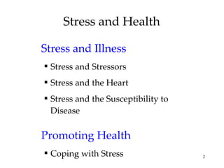 The document discusses stress and health, including how stress can impact the body and lead to illness. It covers how stress can affect the heart, immune system, and susceptibility to disease. It also discusses ways to promote health, cope with stress, and modify behaviors like smoking and diet to reduce health risks.