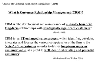 CRM involves developing and maintaining long-term, mutually beneficial relationships with strategically important customers. It is based on trust and value and aims to deliver superior customer value over time. Customer relationships develop through different stages from initial interactions to long-term partnerships. Salespeople play a key role in building and promoting customer relationships by understanding customer needs and adding value at each stage of development. The goal of CRM is turning prospects into loyal, profitable customers through a value creation process.