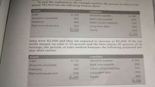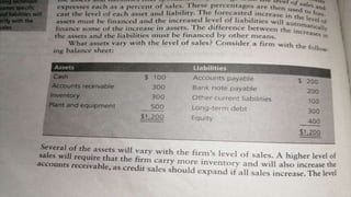 - Some assets like accounts receivable and inventory automatically increase with sales, while others like plant and equipment may require additional investment when capacity is reached from sales growth.