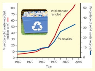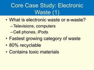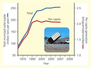 Electronic waste, or e-waste, is the fastest growing category of waste and contains toxic materials. It is important to reduce waste production and find sustainable ways of reusing, recycling, or disposing of solid and hazardous waste. The best approach is to reduce waste at the source, then reuse and recycle materials, and finally safely dispose of remaining waste. Technologies for burning and burying waste exist but have disadvantages like pollution, so reducing waste is preferable.