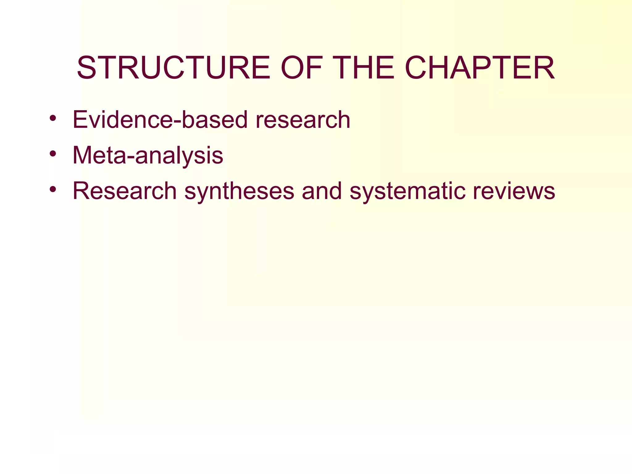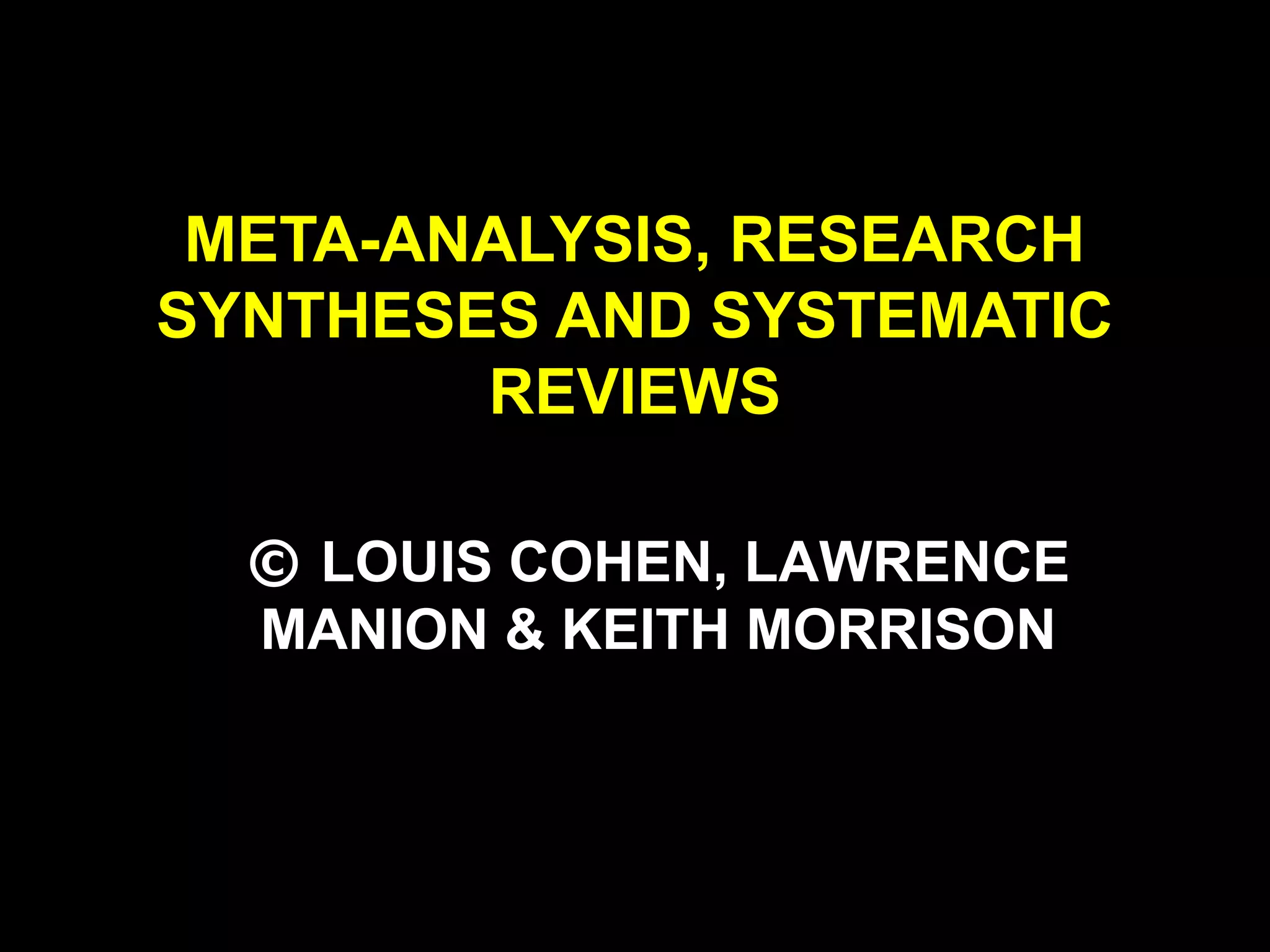 This document discusses meta-analysis, research syntheses, and systematic reviews. It defines meta-analysis as the analysis and combination of results from multiple studies. Concerns about meta-analysis include selective use of studies and failure to account for differences between studies. Systematic reviews follow explicit protocols to minimize bias by combining both qualitative and quantitative studies. The key steps of meta-analysis and systematic reviews are described.