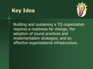 This document provides an overview of key concepts for building and sustaining a total quality organization, including: