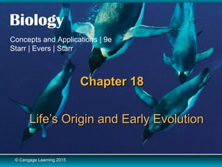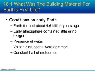 The document discusses the origins and early evolution of life on Earth. It describes some of the conditions on the early Earth and how simple organic compounds may have formed through atmospheric reactions, hydrothermal vents, or delivery by meteorites. It also discusses experiments that demonstrate how self-assembly of these molecules could have led to the first protocells and metabolism, as well as the possible emergence of RNA prior to DNA as the genetic material. The document then covers the divergence of bacteria and archaea, the rise of oxygen due to cyanobacteria, the appearance of eukaryotes, and current hypotheses about the endosymbiotic origins of organelles like mitochondria and chloroplasts.