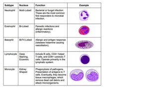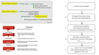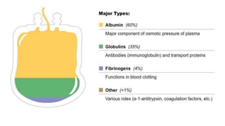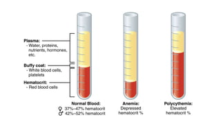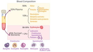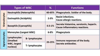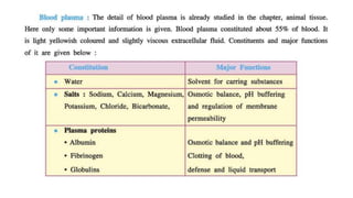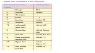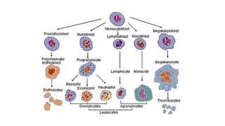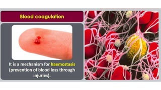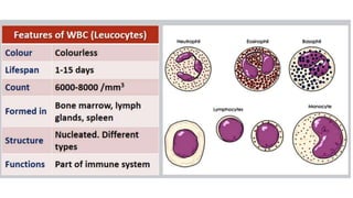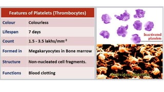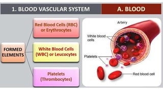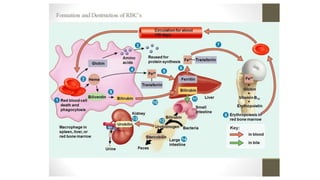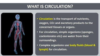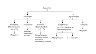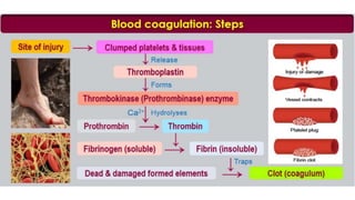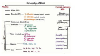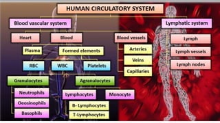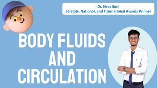 This document discusses body fluids and circulation. It defines terms related to hematology and blood vessels. It describes the formation of blood from hemopoietic tissue in the yolk sac, liver, red bone marrow, and long bone marrow. The document outlines the process of separating blood elements and forming plasma, red blood cells, white blood cells, and platelets. It provides details on characteristics of red blood cells, diseases related to red blood cells, and maturation of red blood cells through vitamins. The document also describes types of white blood cells, platelet functions, and abnormal blood conditions. It concludes with lists of coagulating and anti-coagulating agents in the blood.